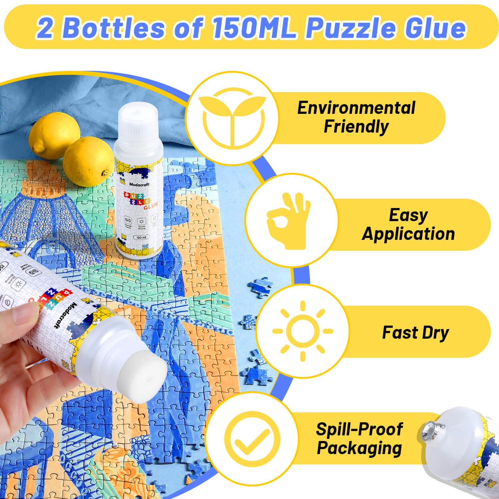 Modacraft 2 Pack 150Ml Jigsaw Puzzle Glue With New Sponge Head, Suitable For 1000/3000/5000 Pieces Of Paper And Wood Puzzle, Clear Quick Dry Jigsaw Puzzle Glue, Used Of Paper Puzzles, 300Ml In Total