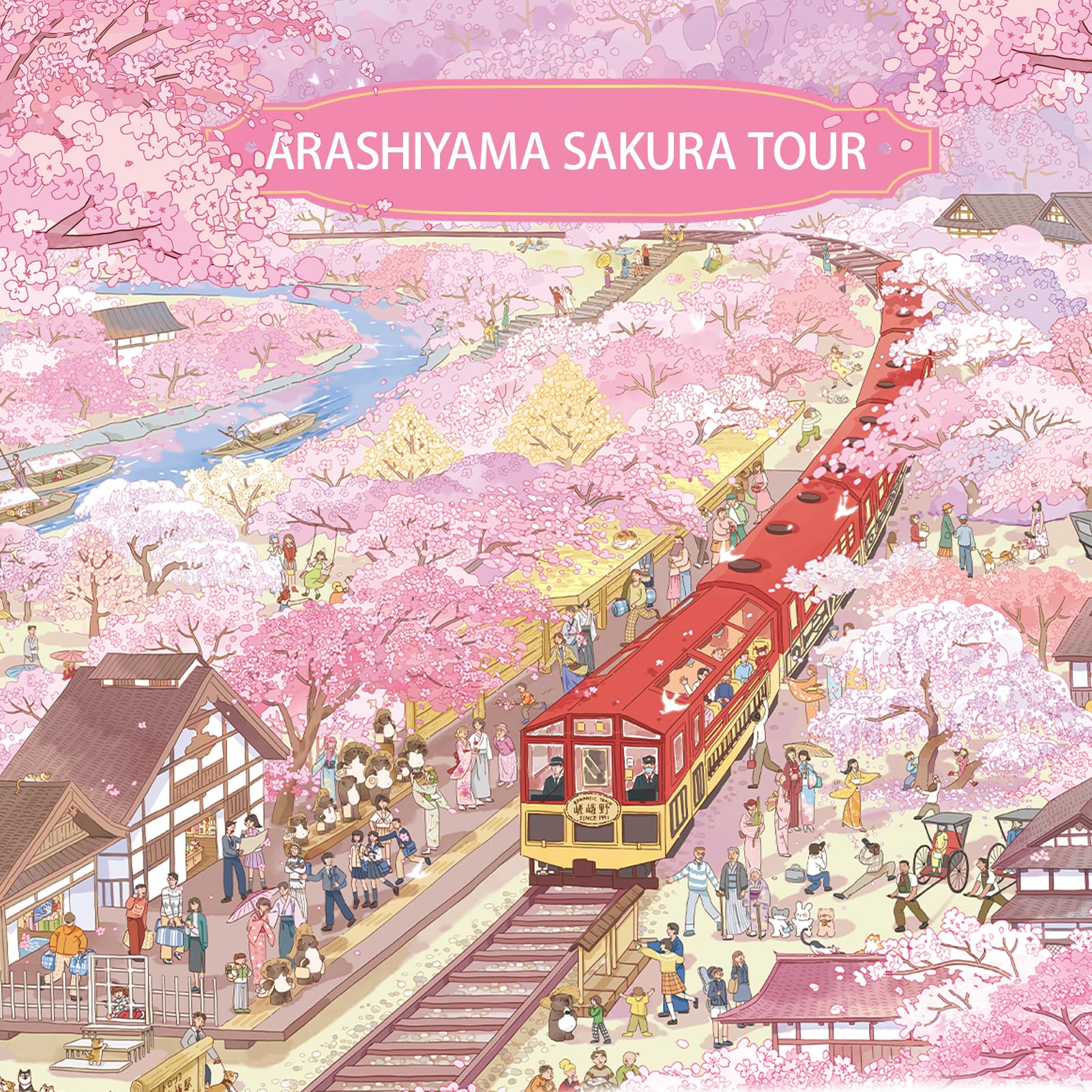 MOMIBOOK Puzzles for Adults 1000 Piece Jigsaw Puzzles of Arashiyama Sakura Tour, Painting Image Cherry Blossom Difficult Challen