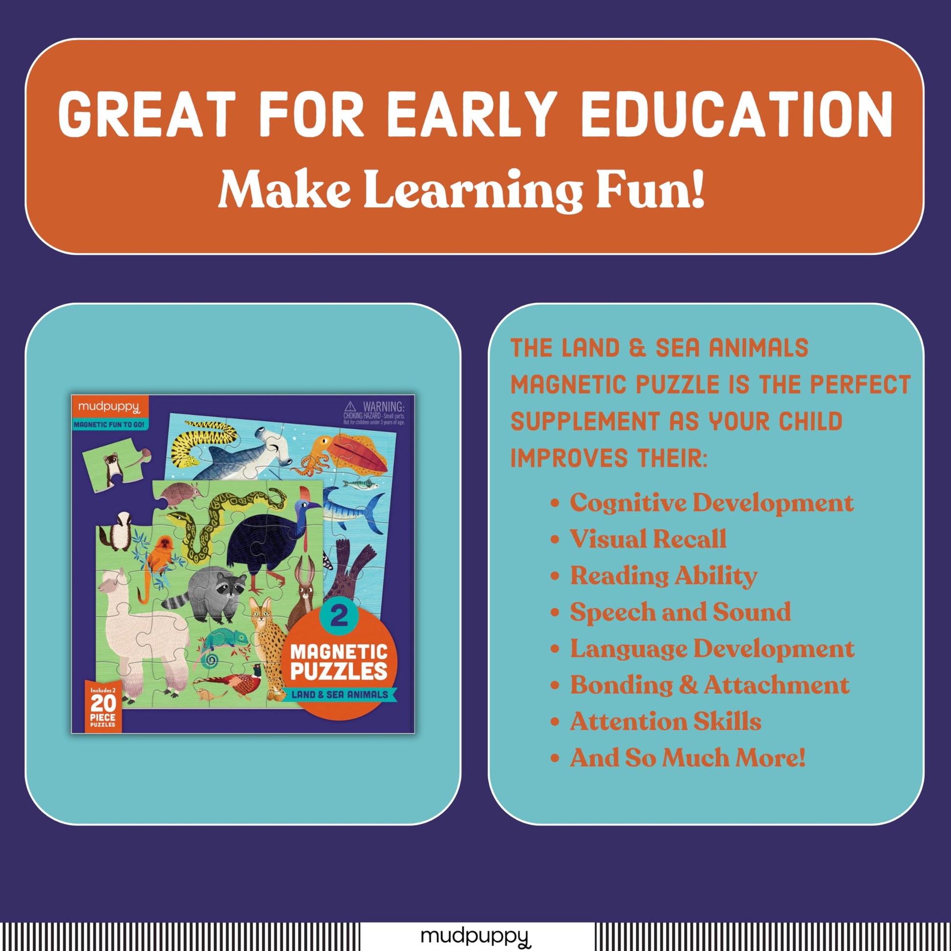 Magnets And Puzzles: What A Wonderful Combination! Even Better - This Package Comes With Two Puzzles In One. Children Will Enjoy One 20-Piece Puzzle Featuring Land Animals, And Another 20-Piece Puzzle Featuring Sea Creatures, All Portrayed In Vivid, Captivating Colors.This Puzzle Is A Great Choice For Children Who Are Slightly New To Playing With Puzzles. Its The Perfect Balance Of Challenge And Fun. Puzzles Like This One Require Concentration And Hand-Eye Coordination, Two Skills Toddlers And Young Children Should Practice On A Daily Basis. Its Also Delightful To See The Animals Come To Life With Each Piece.Traveling Somewhere By Plane, Car, Or Train And Need To Take The Puzzle Along? Its Easy As Can Be. The Portable, Magnetic Package Is A Tri-Fold And Small In Size, Measuring Just 6.75 X 6.75 X .5''. Because Its Magnetic, The Puzzle Pieces Stick To The Portfolio So Theres No Slipping Or Lost Pieces.For Over 25 Years, Mudpuppy Has Created Quality Non-Digital Puzzles, Games And Toys For Children And Families That Facilitate Creative Play And Imaginative Thinking. All Mudpuppy Products Adhere To Cpsia, Astm, And Ce Safety Regulations. Environmentally Conscious, The Puzzle Greyboard Contains 90% Recycled Paper, The Packaging Contains 70% Recycled Paper And It Is Printed With Nontoxic Inks.