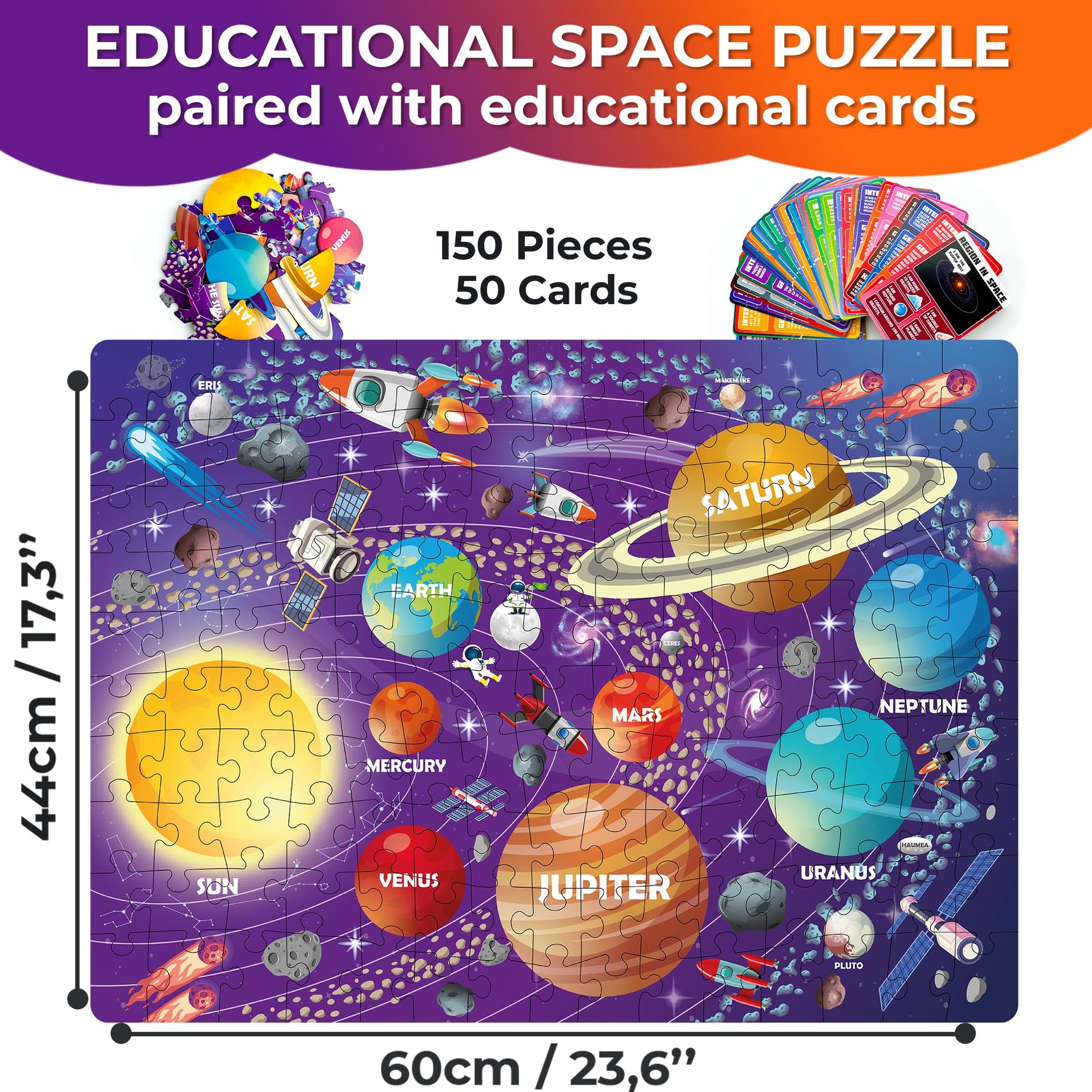 - Q: What educational benefits do the double-sided flashcards provide? A: The 50 double-sided flashcards included with the puzzles feature over 400 fascinating facts about space, enhancing learning and curiosity beyond just assembling the puzzle.