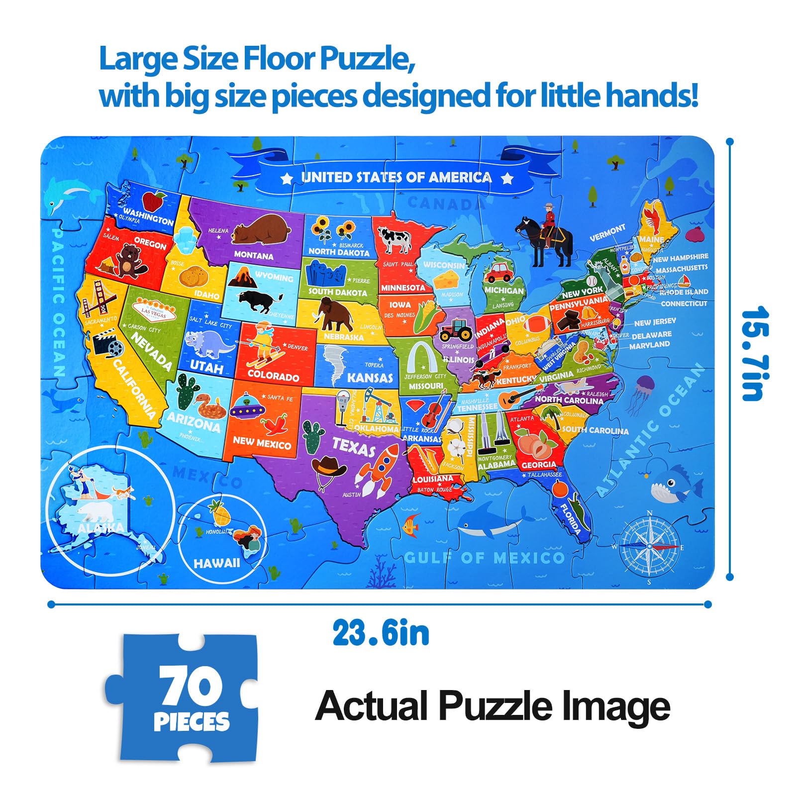• Q: How many pieces does the USA Map Puzzle have and what are its dimensions? A: This puzzle contains 70 pieces and measures 60 x 44 cm when fully assembled, providing ample space for kids to explore the geography of the United States.