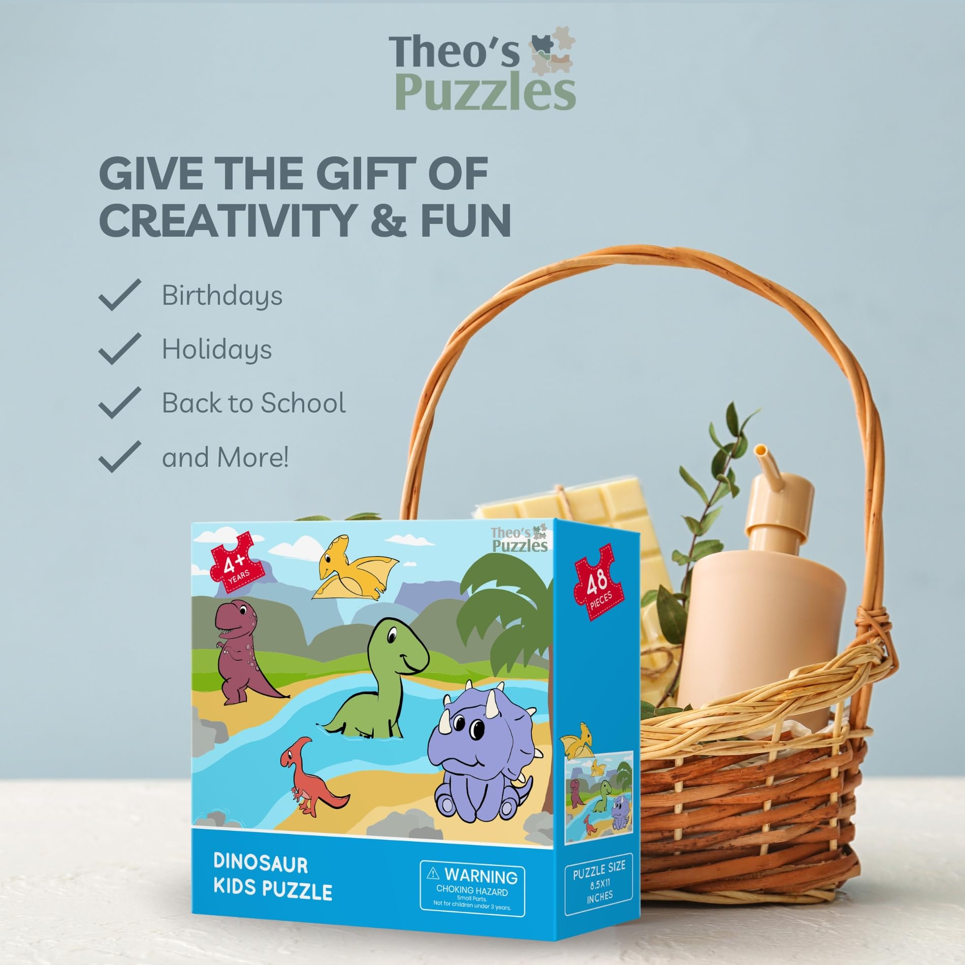Theo'S Puzzles Dinosaur Kids Puzzle - Fun 48-Piece Jigsaw With Diverse Dinosaur, Rivers, And Volcano Scenery For Ages 4+, Perfec