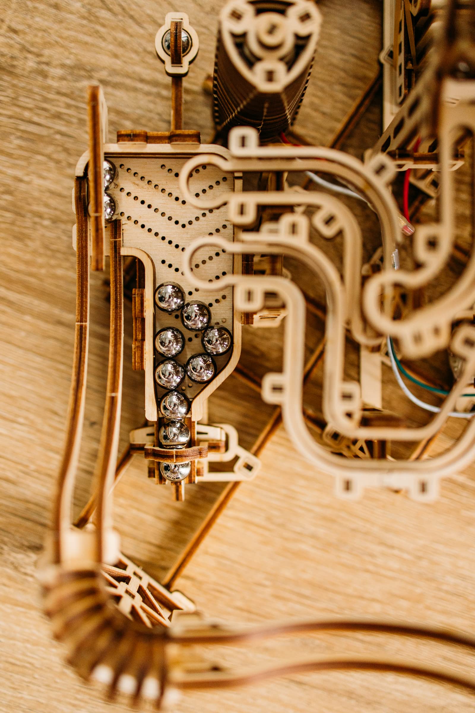 NATURAL WOOD – Spiral Marble run model is made entirely of wood and requires no glue/toothpicks to be fully assembled. Put together 558 pieces and create a fascinating marble roller coaster! Comes with 9 metal marbles and an illustrated assembly guide. Dimensions: 13*12.7*12.4 in | PERPETUAL MOVEMENT - To create this breathtaking marble run puzzle, we were inspired by a perpetual motion machine. There’s nothing to stop the marbles' journey! This roller coaster is equipped with an electric motor powered by 4 AA batteries, 1.5V. Batteries are not included in the kit | INTERACTIVE DESIGN - Developed by professional engineers, this 3D puzzle for adults is well-thought-out and will fascinate all DIY lovers. A special «paw» puts the marbles on the start, then they jump on the steps and are spread on three connected tracks. Assemble it and watch non-stop movement magic! | HIGH COMPLEXITY - This wooden assembly kit makes it a real challenge and is recommended for experienced DIY fans. Taking about 6–8 hours to assemble, this model kit for adults develops perseverance & fine motor skills | ENTERTAINING SCIENCE - Curiosity forms the basis for our 3D puzzles for adults. Are you excited about complicated mechanical games? WoodTrick will immerse you in the world of physics and mechanics and show you what's inside | PERFECT GIFT TO ALL - Our wooden models for adults to build are a nice choice for Christmas holidays, Father’s Day, Valentine’s, Back-to-School and others. Share the real engineering joooooooy of 3D puzzles with your beloved ones!