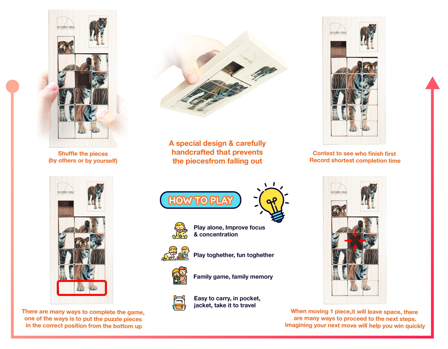 Slide the puzzle pieces to complete the pattern The pieces cannot be disassembledChange 2 marker positions to create a lot of puzzlesPlay alone or fun contest with family membersEntertain, develop thinking, ability to imagineNot so easy not so hardlySafe and durable products