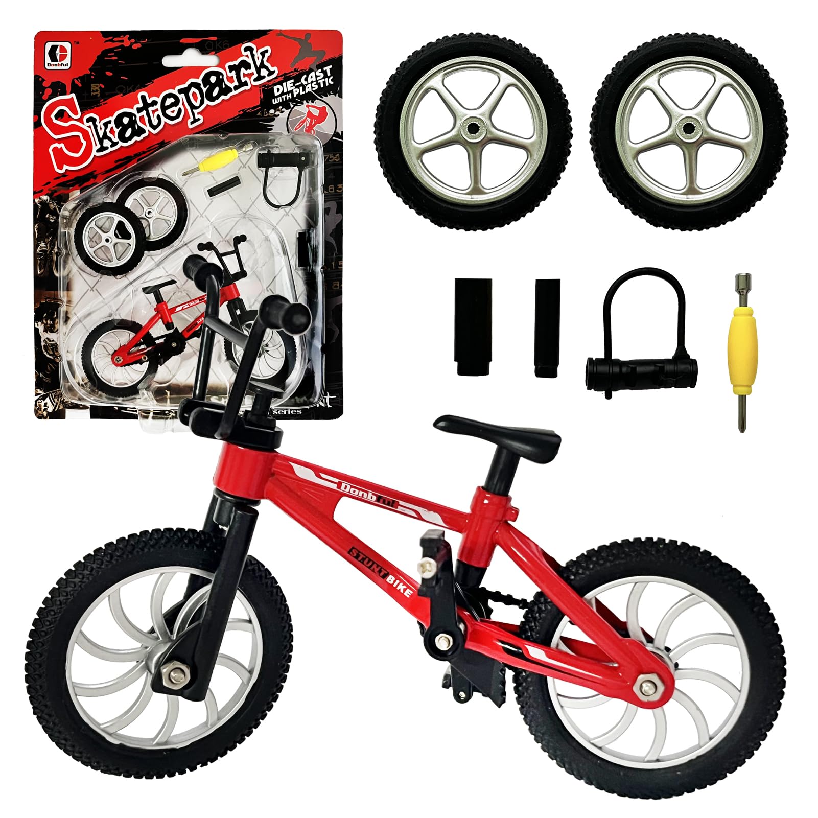 • Q: What is included in the packaging of the Mini Finger BMX Set? A: The packaging includes 1 Mini bike, 2 replacement skateboard wheels, and 1 lock, providing everything you need to start enjoying this functional toy.