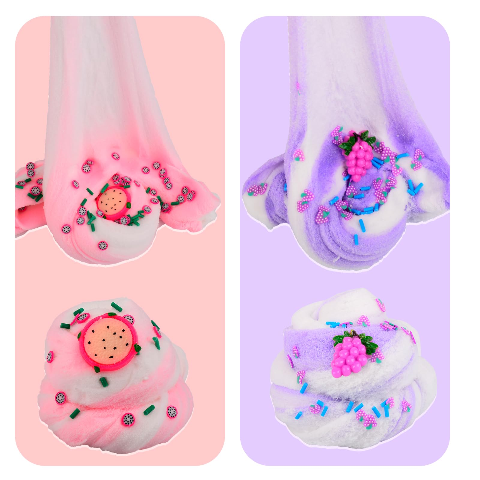 2 Pack Cloud Slime Kit Cloud Slime with Pink Pitaya Purple Grape Charms Scented DIY Slime Supplies for Girls and Boys Stress Relief Toy for Kids' Education Party Favor Birthday Gift