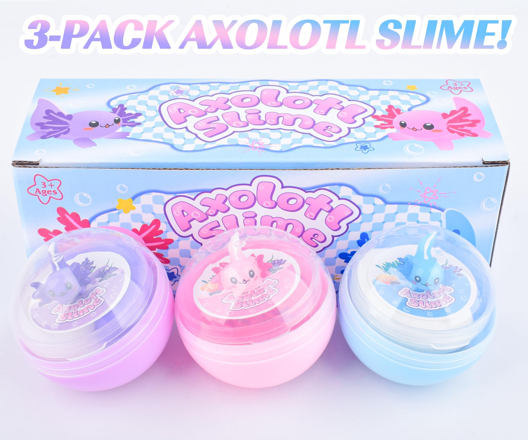 3 Pack Axolotl Slime Kit, Blue Butter, Purple Cloud, Pink Crunchy Slime with Axolotl Charms, Soft, Stretchy, Slime Party Favor f