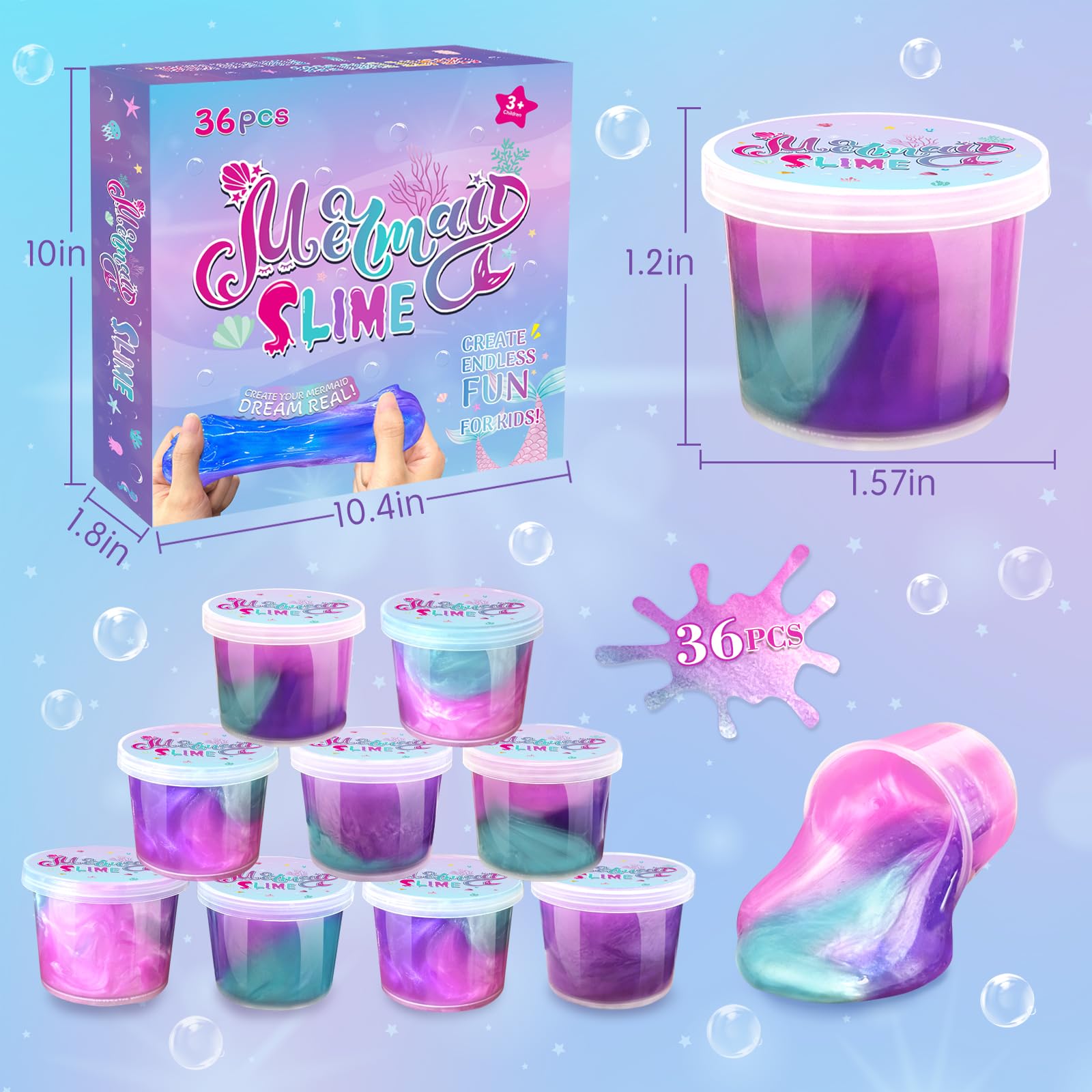 36 Pack Mermaid Slime Party Favors For Kids Mermaid Slime Colors Mixing 3 Different Slime Colors Will Definitely Surprise Children. Let The Kids Explore The Mysteries Of Mermaid Together And Add More Fun To The Party! Play And Education The Slime Pack Is Super Soft, Stretchy And Non-Messy, Kids Play With It For A Long Time In Different Way Can Exercise The Kids' Coordination Ability That Help Develop Kids Ability Of Hand-Make And Imagine. Beautifully Packaged Great For Kids Birthday Party Favors, Easter Basket Stuffers, Goodie Bags Stuffers , Classroom Rewards, Educational Game, Christmas Stocking Stuffer, Birthday Party Treat, Halloween, Thanksgiving, Holiday Prize For Kids Ages 3-12. Relieves Stress When Playing With Slime, A Lot Of Small Bubbles Will Be Formed, And These Small Bubbles Will Cause The Slime To Get Bigger And Fluffier. When You Press With Your Fingers, There Will Be A Crisp Bubble Sound, And The Touch Of Your Fingers Is Also Very Comfortable, So That You Can Relieve Stress Very Much. [Warm Tips] 1. It Is Reusable Slime Kit, Please Store Back Into The Cup And Cover It After Use, So It Will Not Dry Out, Please Knead The Slime Several Times Before You Start Pulling, This Will Make It More Stretchy,&Nbsp; 2. Please Don'T Play On Carpet.&Nbsp; 3. Recommended For Children 5 And Up. Do Not Eat. Not Intended For Children Under 3.