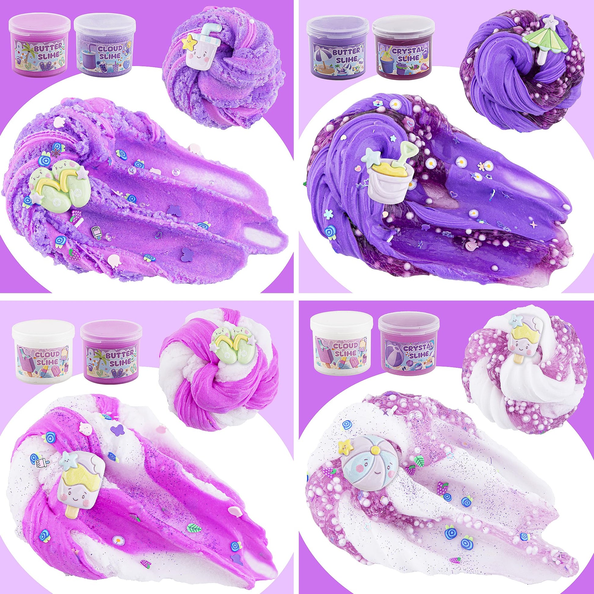 • Variety of Textures: The kit includes 3 different textures of slime: 2 packs each of purple butter slime, purple cloud slime, and purple clear crystal slime, providing a delightful tactile experience.