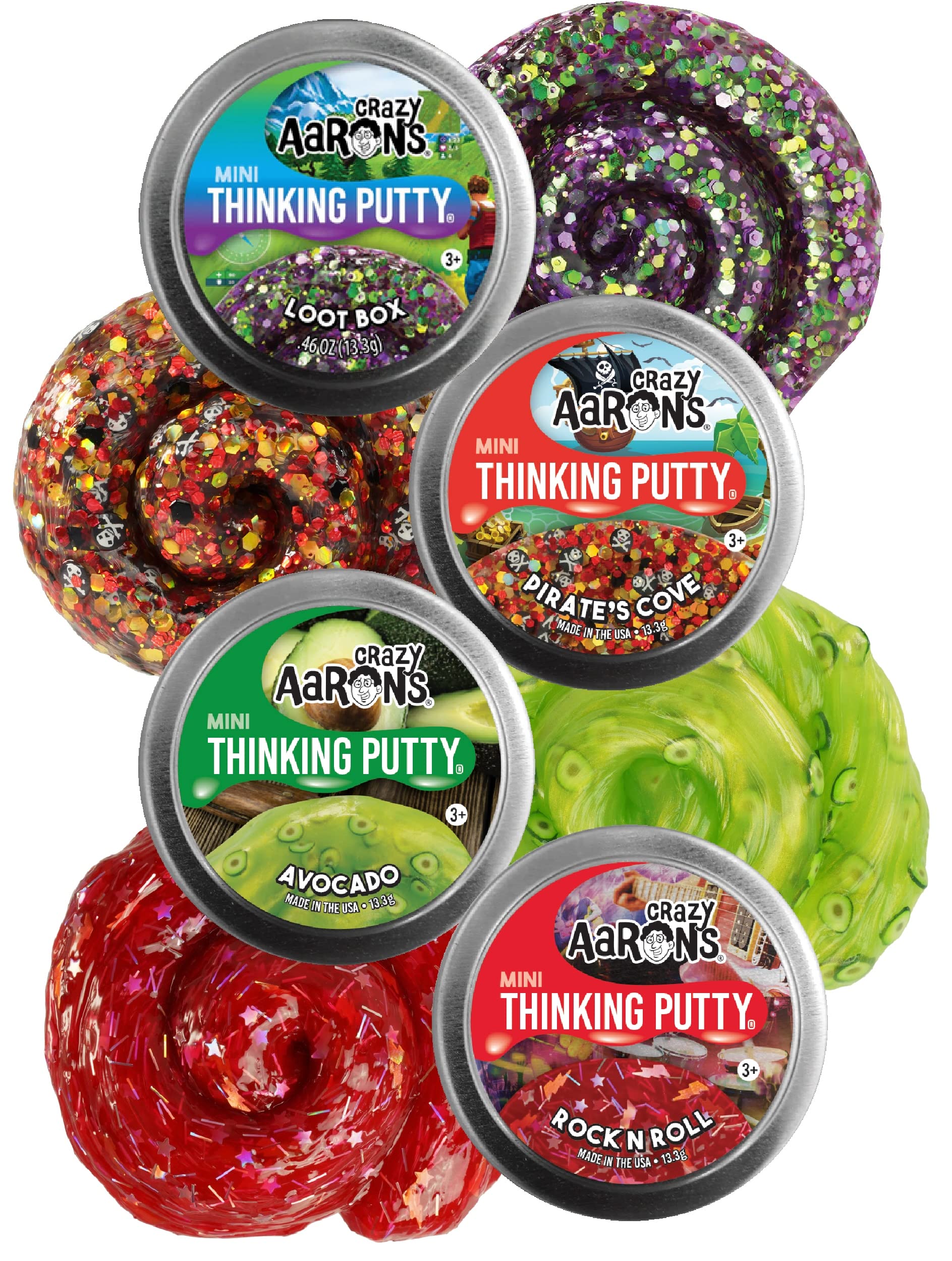 Crazy Aaron'S Putty Mini Tins Loot Box, Rock N' Roll, Pirate'S Cove & Avocado Gift Set Bundle - 4 Pack (13.3G Each) Is Awesome! This Is An Amazing Sample Set Of 4 (2 Inch, .47Oz) Mini Tins From Crazy Aaron! This Set Is Ideal For Party Favors, Special Needs, Stocking Stuffers, Schools And So Much More! Loot Box - This Glitter Treasure Chest Will Reward You With Green And Purple Sparkle. Unlock This Tin To Get Your Putty Game On! Rock N' Roll - Dig In Rock Out! Crank It All The Way Up, And Rock Till Ya Drop With This Classic Jam. Pirate'S Cove - Blimey! This Putty Is Chock Full O' Skulls For Matey'S Seeking Adventure. Explore At Your Own Risk! Avocado - Avocados Are Always A Good Idea. And This Putty, Filled With Teeny Avo-Cuties, Is About To Guac Your World! Helps Build Hand And Finger Strength Through A Fabulous Tactile Play Experience With Unique, Unexpected Properties And Provides Relaxing, Yet Stimulating Interaction For Anyone With Sensory Integration Issues. For Ages 3 And Up - Made In The Usa - Makes A Great Gift!