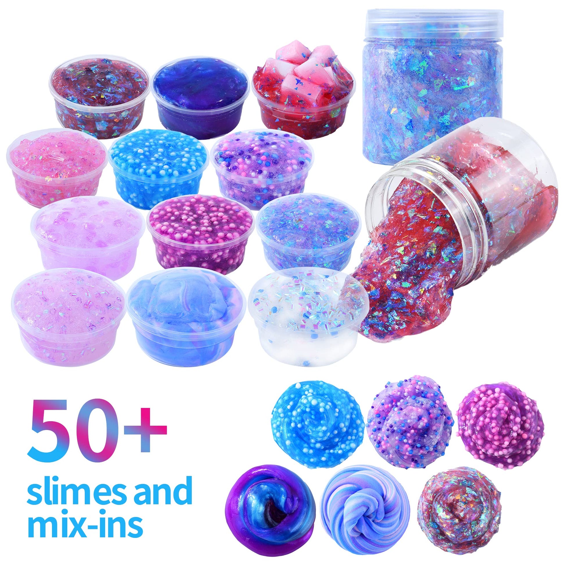 1. The unicorn slime kit for girls 4-12 The kit contains chunky iridescent glitter in five differnt colors, three packs of teeny foam balls in two sizes, three packets of different colored beads, three packets of different shades of metalic slime, four packets of various colored slime, the large tub of clear slime for creating art with the treasures this kit offers, it includes a small mixing bowl and assorted containers with lids to store your custom creations | 2.All-in-one set ,Crunchy slime with charm,squeeze it,twist it,smash it ,It can be used to relieve stress and relieve anxiety,great for kids to play! | 3.Unicorn color candy confetti scrap with sponge cubes can be jelly cubes slime and unicorn candy slime There are so many add-ins. The possibilities are endless | 4.Unicorn colors butter slime super soft,Stress Relief ,develop childrens ability to handmake and imagine. | 5. it is amazing clear slime with all of the containers and mix-ins it comes with it is a delightful experience!