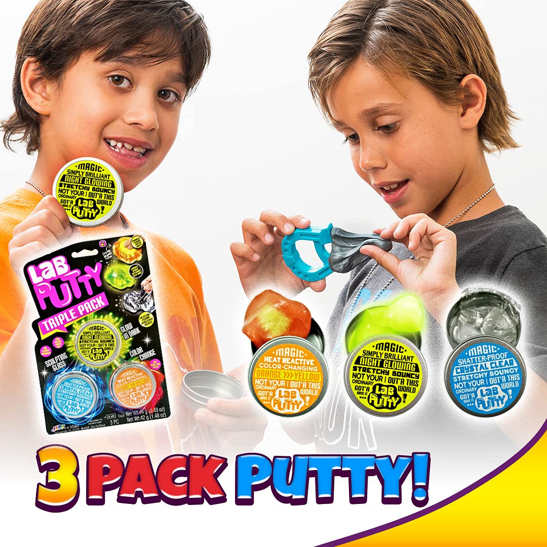 - 1 Bundle Pack of Lab Putty: Each set includes 3 assorted putties, including glow in the dark slime for kids, clear slime, bouncy putty, magnetic putty, and color-changing lab putty.