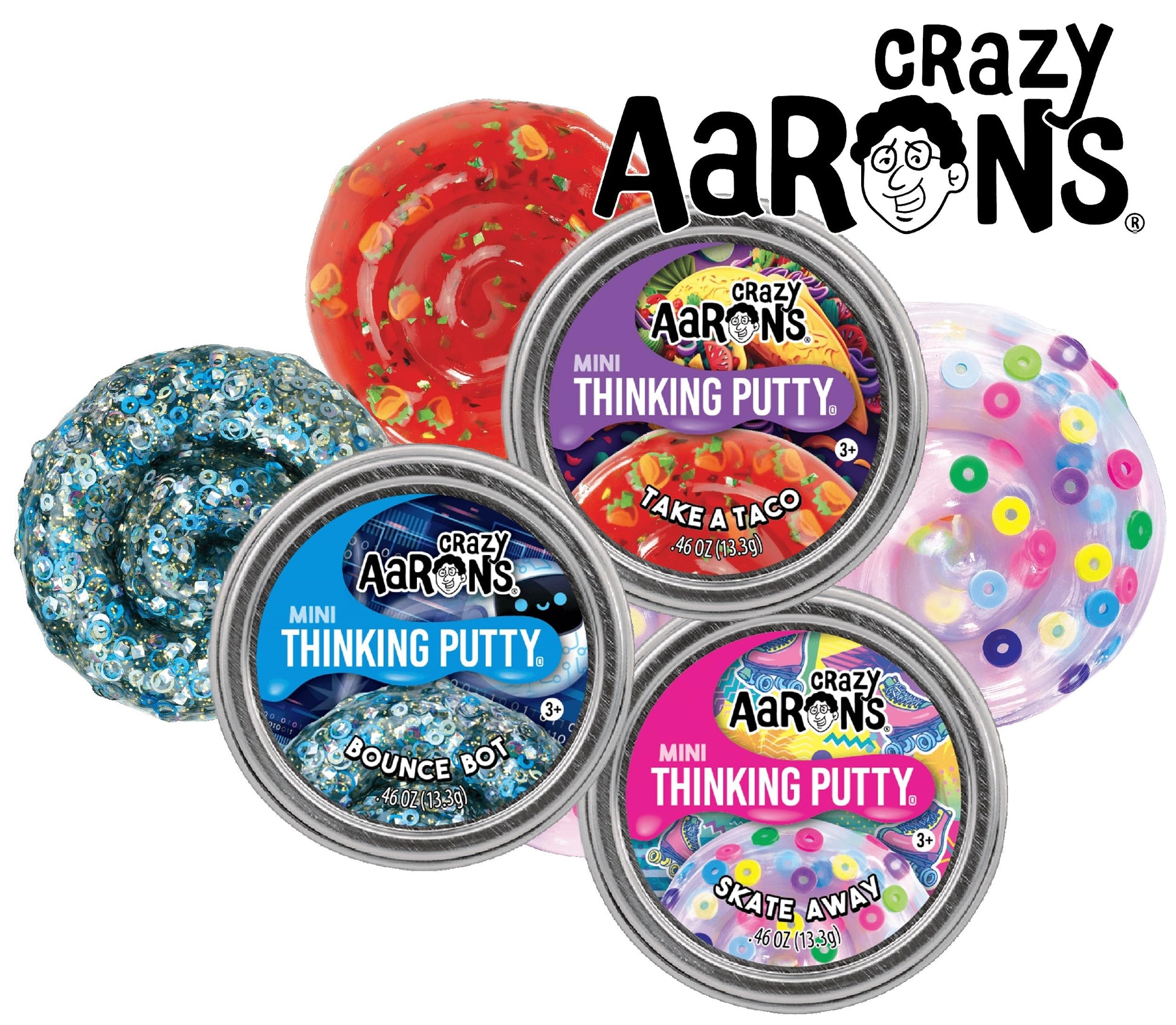 Mattys Toy Stop Crazy Aarons Putty Mini Tins Bounce Bot, Skate Away & Take-A-Taco Gift Set Bundle - 3 Pack (13.3g Each)