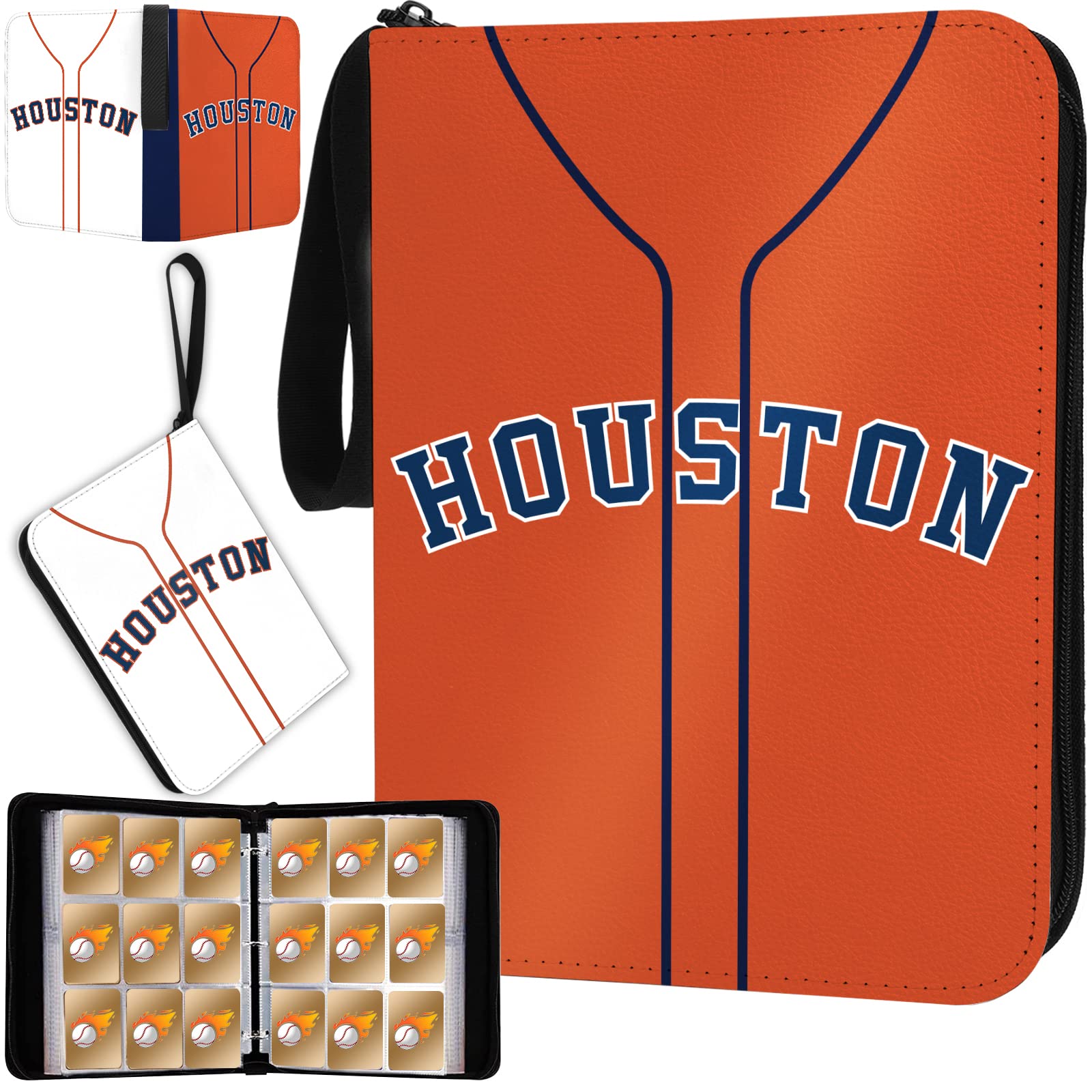 Product Detail:Material: PU leather, EVA foamColor: Houston Orange Size: 10.6* 13.2* 2 inches Weight: 1.1KG / 2.4lbs Package Include Baseball cards folder binder 9 pocket fits up to 900 cards (CARDS ARE NOT INCLUDED)Features: 1. Houston Baseball ThemeOUr Baseball trading cards holder can hold your baseball cards, fans cards and decorate your room to celebrate the game 2. Increase Baseball Atmosphere: The classic pattern is filled of sports elements, inspiring sportsmanshipNote: Cards are NOT included.