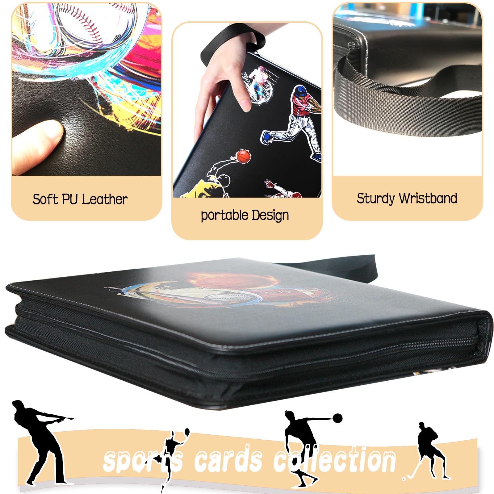 This Sports card binder is made of high quality PU leather, durable and waterproof. Highly transparent card sleeve for easy display and browsing. The zipper design ensures that the cards cannot be lost. All-round protection for your cards. The 9-pocket card binder with 50-page sleeve can hold 900 cards. Store and display your cards in this trading card binder to keep them organized. Compatible for Different Card, Trading card binder fits all standard size cards like football cards, baseball cards, top aces, game cards, attack cards and more.