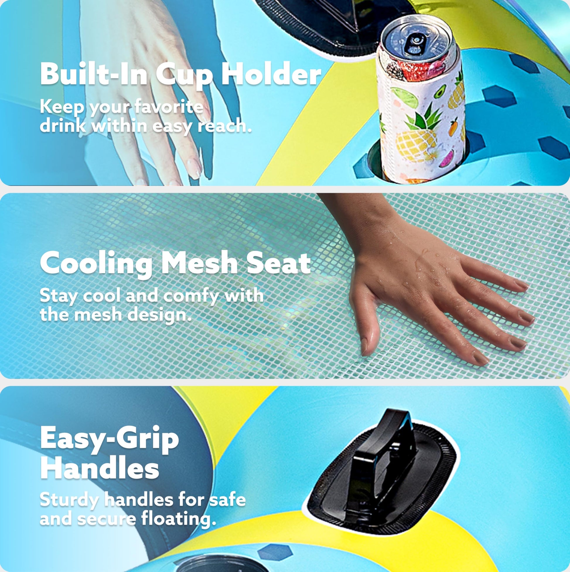 COOLING MESH SEAT: Stay comfortable and refreshed with the breathable mesh seat that allows water to cool you as you float. | DURABLE PVC MATERIAL: Crafted from high-quality, touch, and puncture-resistant PVC to ensure long-lasting fun and reliability. | SAFE AND SECURE HANDLES: Equipped with two easy-grab handles, providing stability and security while floating. | SECURE BUCKLE FOR CONNECTING TUBES: Includes a secure buckle to easily attach multiple tubes for group adventures or fun on the water. | PORTABLE & EASY TO STORE: Lightweight and deflates quickly for compact storage and convenient transport. | BONUS REPAIR PATCH INCLUDED: Comes with a repair patch for quick and easy fixes, ensuring uninterrupted enjoyment.