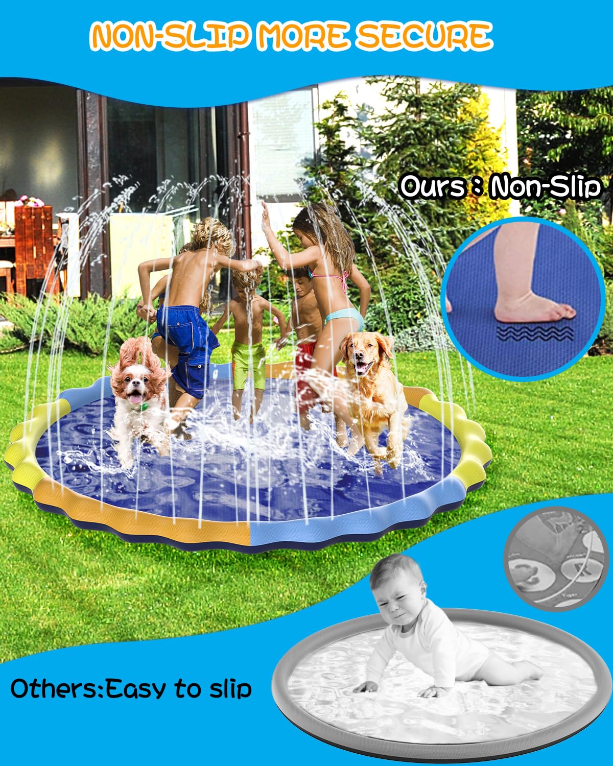 Instraella 124'' Large Splash Pad for Dog and Kids, 10.3FT Non-Slip Sprinkler Mat 1mm Thickened and Foldable Large Pool Summer F