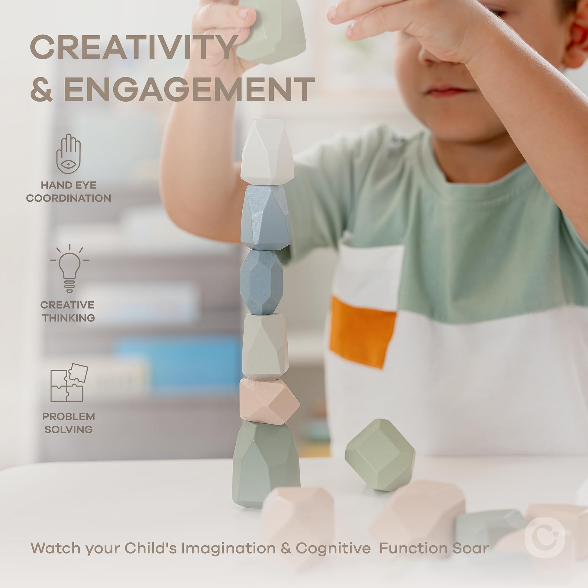 Comfy Cubs Stacking Rocks 36 Pieces, 36 Months+, Educational Toddler Stacking Blocks, Promotes Imagination, Balance & Fine Motor Skills - Wooden Rocks Sensory Toys Gift For Kid, Neutral Pack
