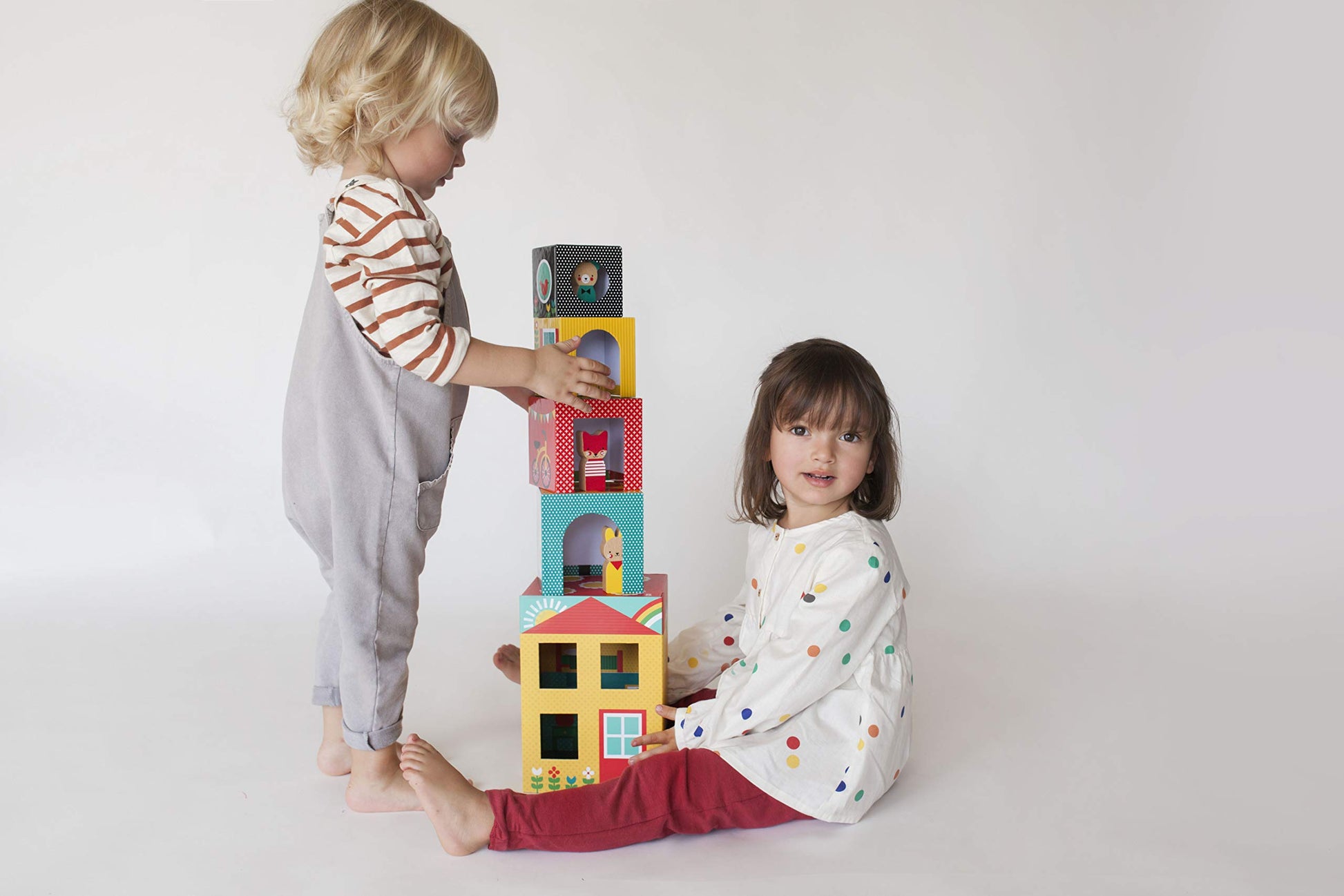 Stack the four blocks to make the Peek a Boo House for your three new friends! Playset includes four stacking blocks that nest inside each other for easy and compact storage. Also includes three sweet solid beechwood animal friends for all day play. Packaging doubles as a play house with magnetic closure and a rope handle, perfect for on the go fun. Sturdy construction made from recycled card, printed with non-toxic environmentally friendly vegetable inks. Perfect for ages 18 months and up.