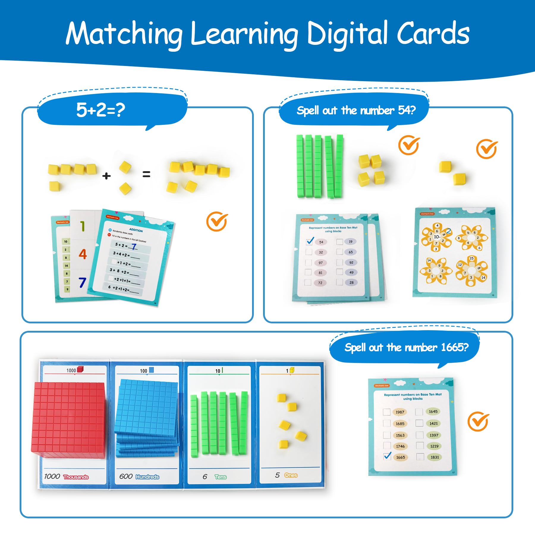 - Q: How can these Base Ten Blocks enhance my child's math learning? A: These Base Ten Blocks are excellent for teaching concepts such as place value, number sense, and basic math operations like addition and subtraction. The colorful manipulatives make learning fun and interactive, fostering logical thinking and hand-eye coordination.