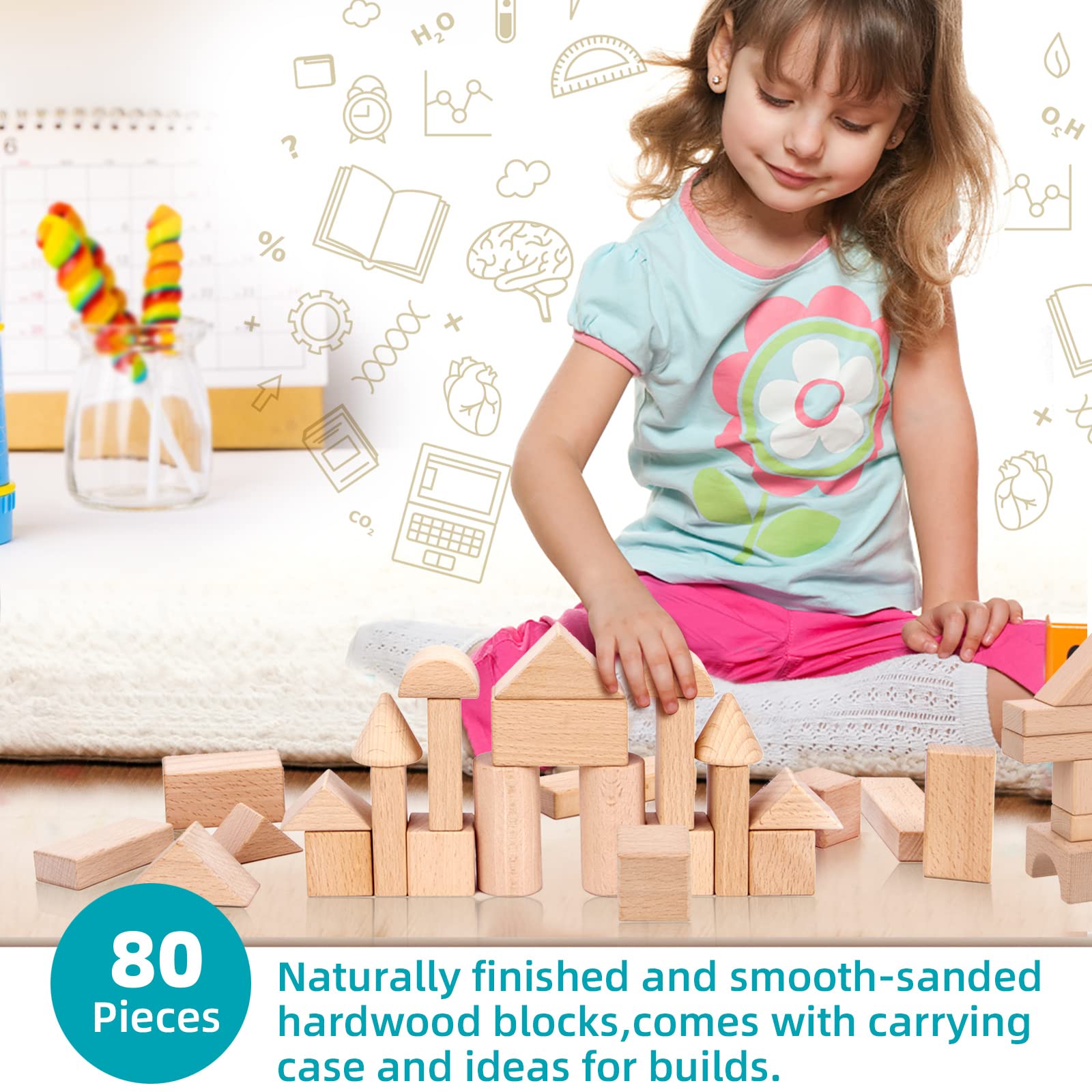 Timfuis Wooden Building Blocks Set, 80 PCS Natural Wood Stacking Block Toy with Carrying Bag, Montessori Learning Birthday Gifts