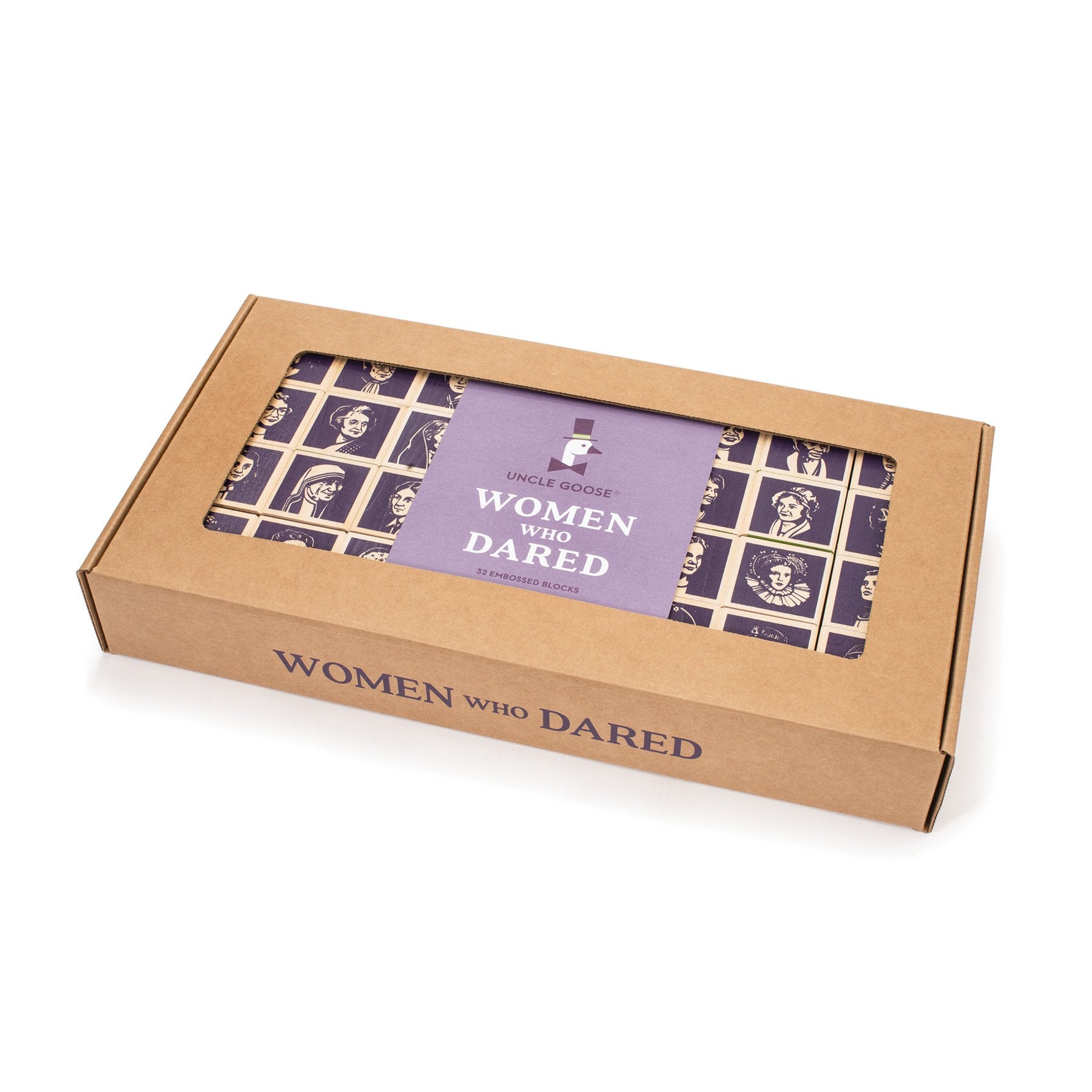 - Q: How are the Uncle Goose Women Who Dared Blocks different from regular building blocks? A: Unlike regular building blocks, these 32 basswood cubes feature embossed images of women who made significant contributions to society, promoting education and awareness about women's history while encouraging imaginative play.