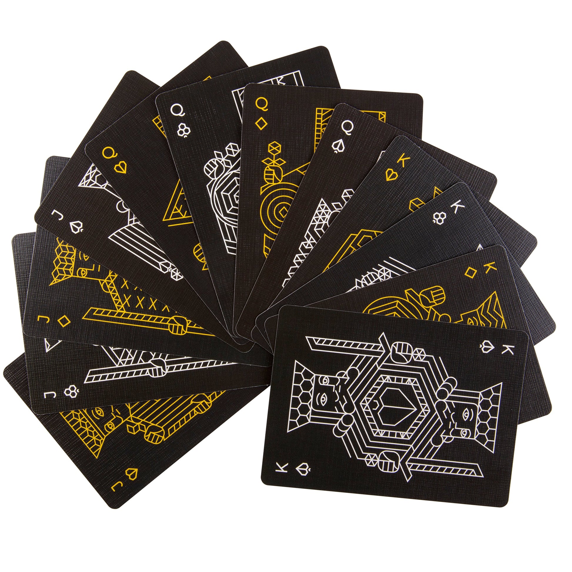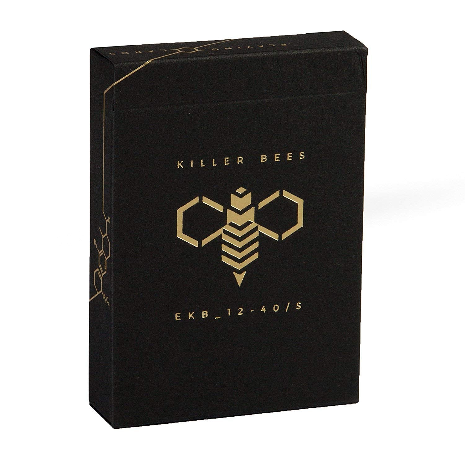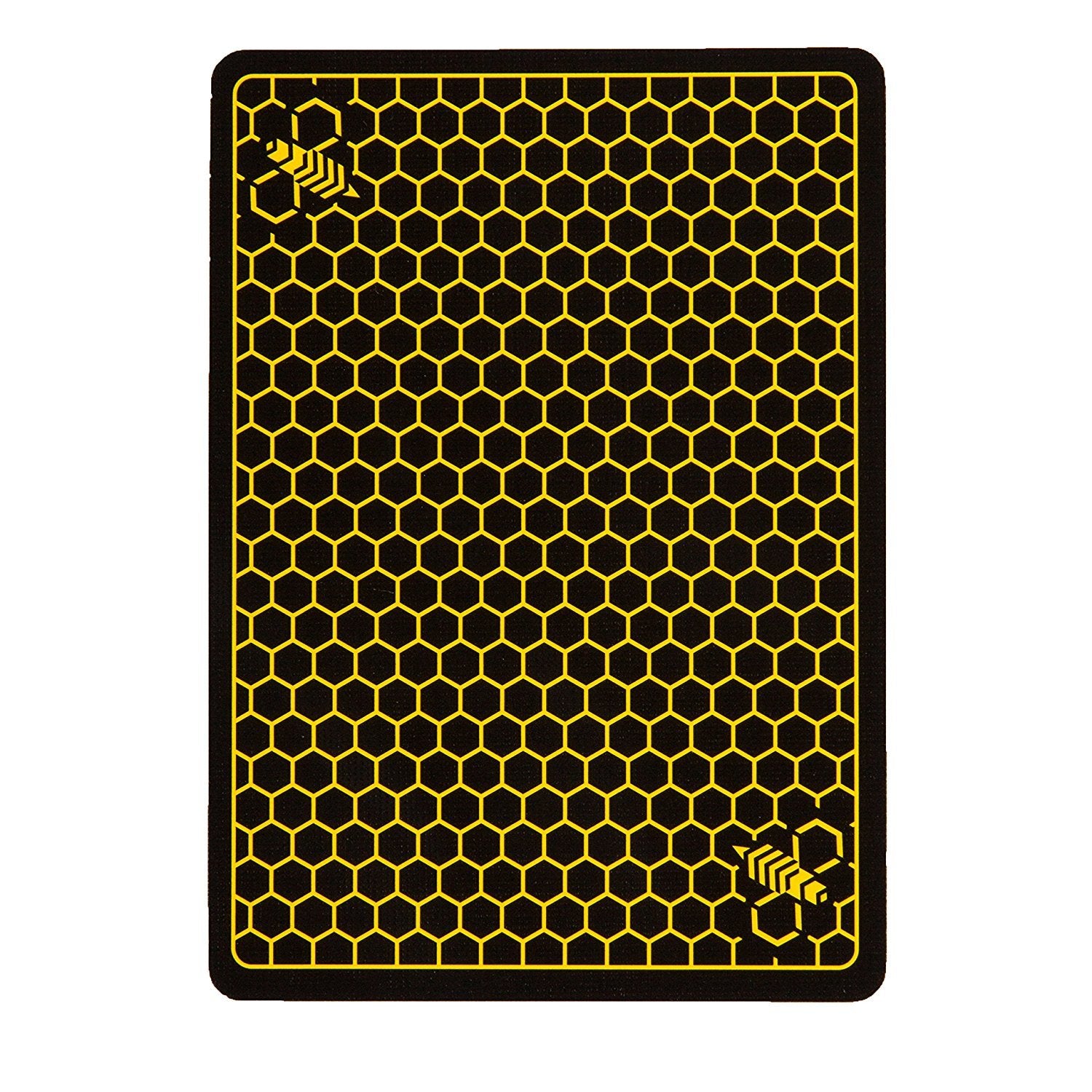 Killer Bees Playing Cards Deck by Ellusionist - This deck captures the darker bodies of these cold-face killers in our deck. Creating a harsh black back with toxic-waste yellow honeycomb spilt on the back. The black faces display custom pips and hold a sinister simplicity. Like something youd expect to see on a discarded barrel of methylamine.