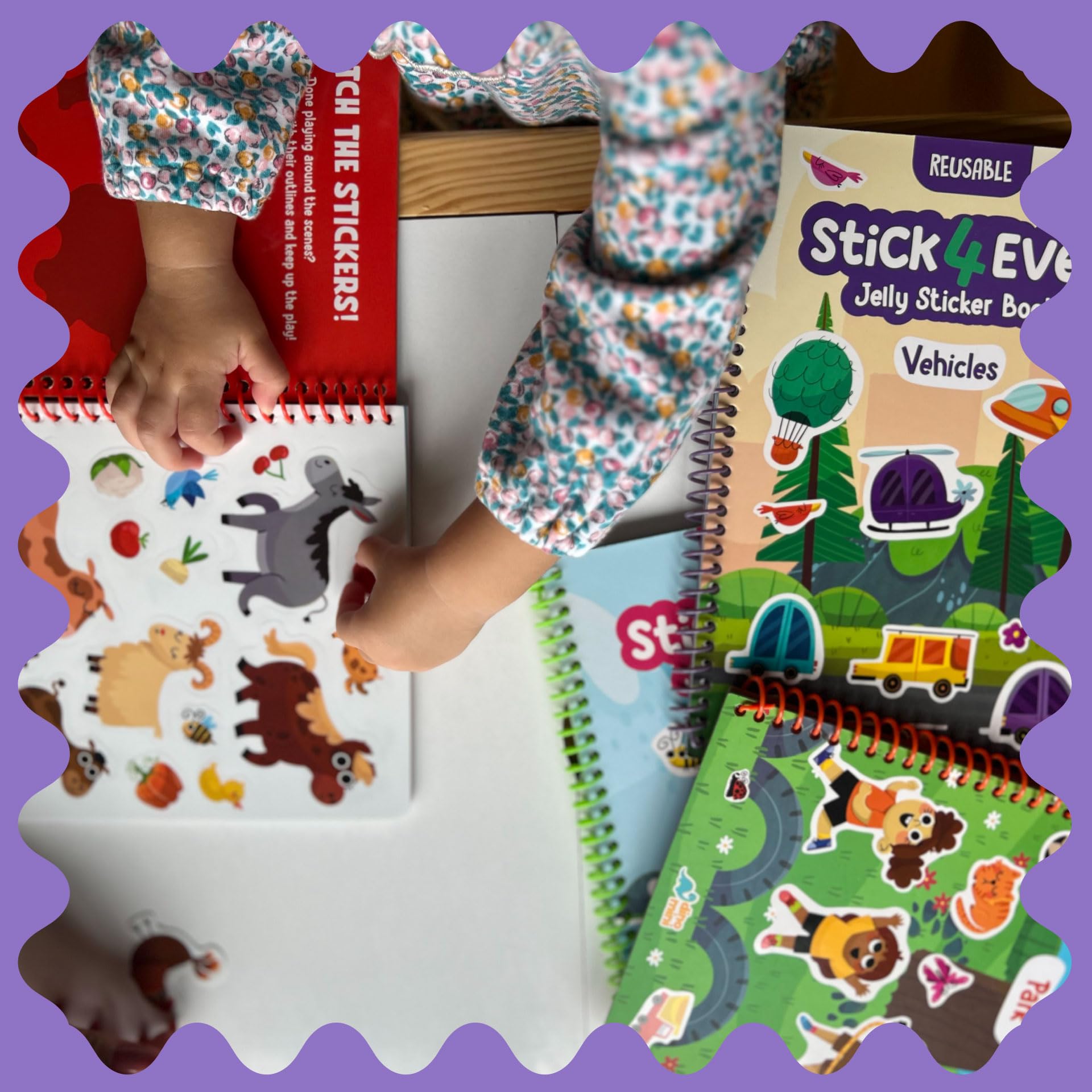 - Q: What is included in the Stick4Ever Jelly Sticker Book? A: The Stick4Ever Jelly Sticker Book includes 50 colorful jelly stickers and features 7 different hand-drawn scenes. The spiral-bound design adds durability and makes it easy for kids to flip through and enjoy their sticker activities.