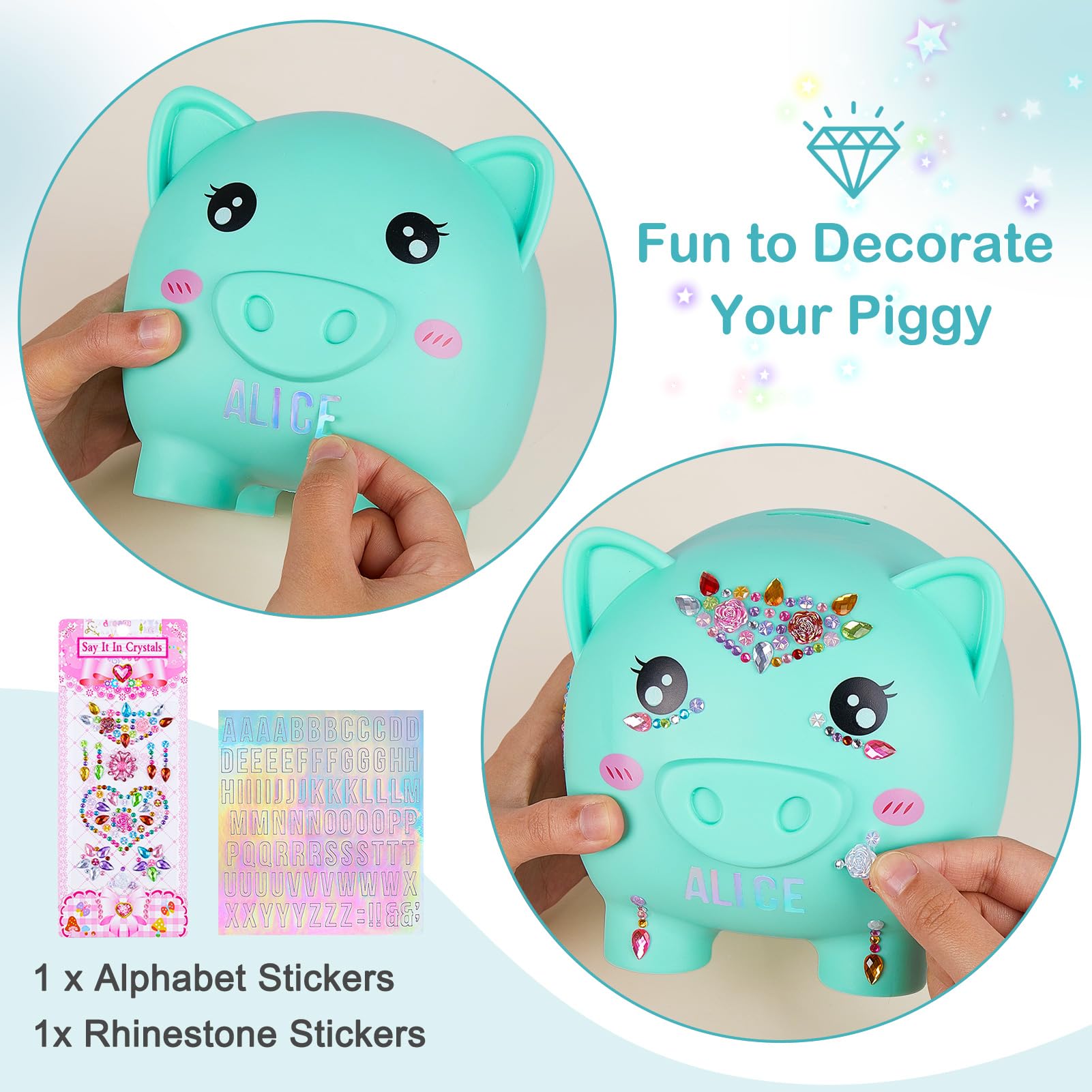 • Q: Can my child personalize the Piggy Bank? A: Absolutely! The Piggy Bank comes with fun DIY stickers, including alphabet stickers for personalizing with their name and rhinestone stickers for decoration, making it a creative and engaging gift.