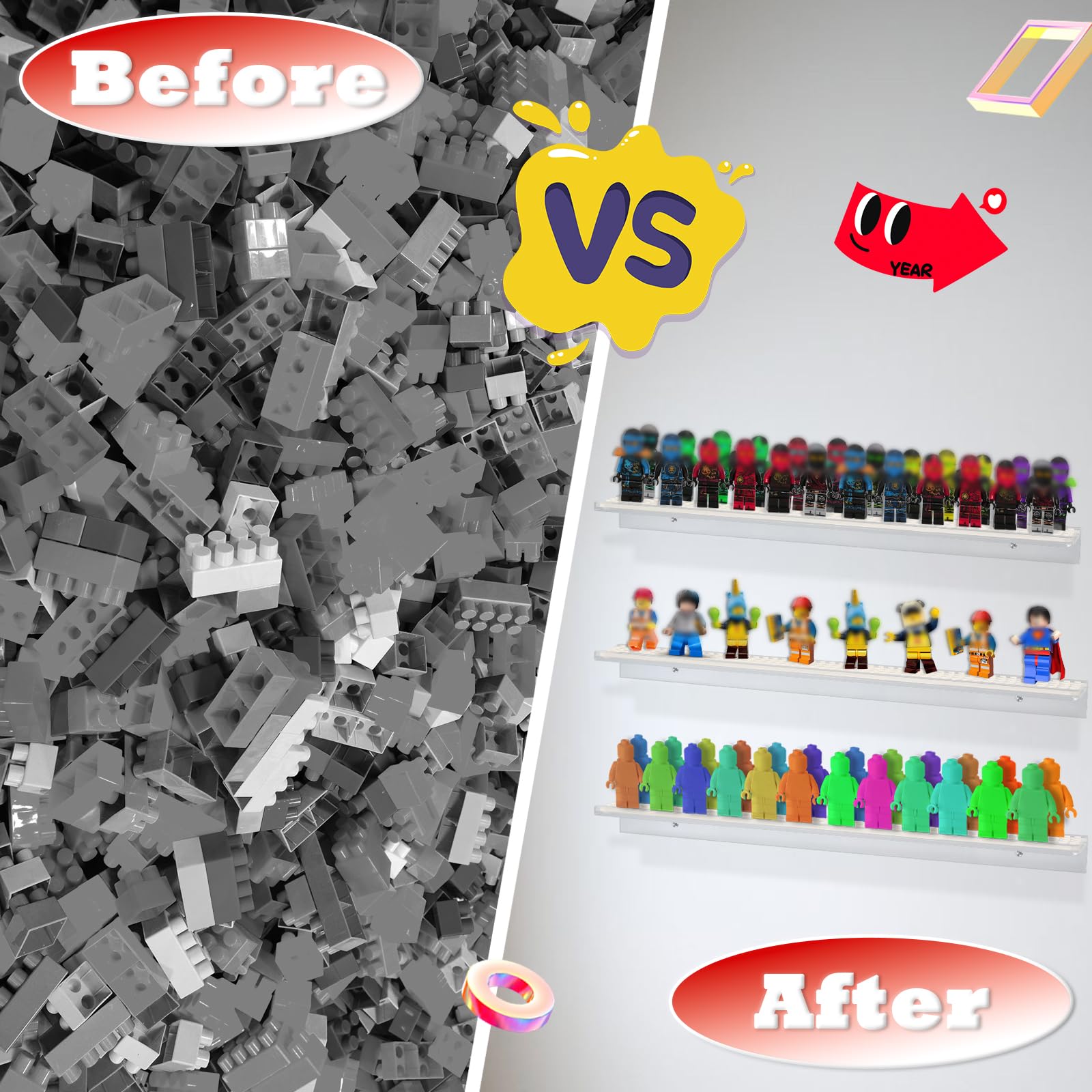 • Q: Can these display shelves be mounted on any wall? A: Yes, the floating design of the display shelves allows them to be mounted on any wall. They create a stylish floating effect, making them a great addition to any room where you want to showcase your building block figurines.