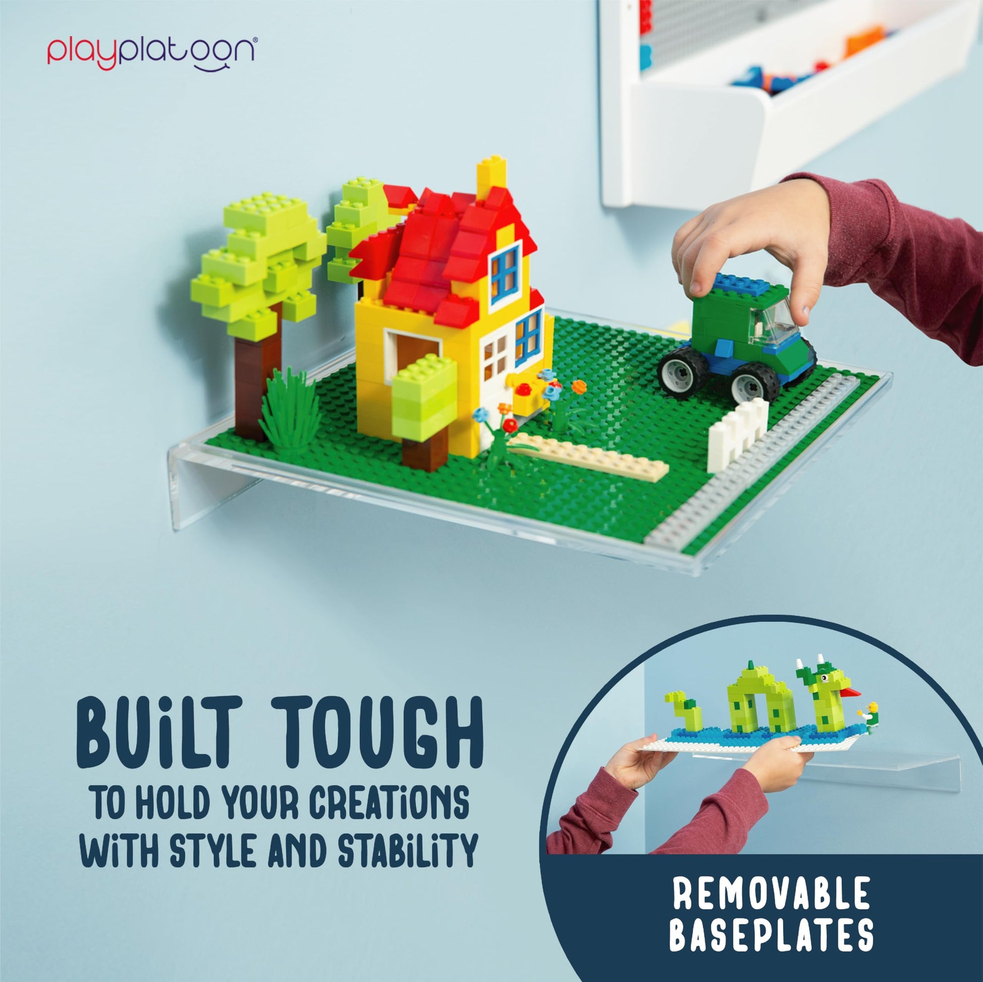 Display your favorite brick builds and minifigures with the Play Platoon Building Brick Display Shelves, a 2-pack set of 10x10 inch floating shelves for legos display wall that transforms any space into a stunning showcase. Designed to be compatible with all major building block brands, these shelves for legos display wall let you arrange and enjoy your lego collections in style, whether for playful display or serious collecting. The sleek, clear acrylic shelves offer a modern aesthetic that blends into any decor, while providing durability to support everything from larger builds to a lego figure display case of treasured minifigures. With easy installation from the included wall mount kit, youll have your display shelves for lego sets up and ready to hold your pieces in minutes. Perfect as a shelf for lego display or floating shelves for legos display wall, these versatile shelves fit anywhere from kids rooms to office spaces, and are a must-have for lego fans of any age.