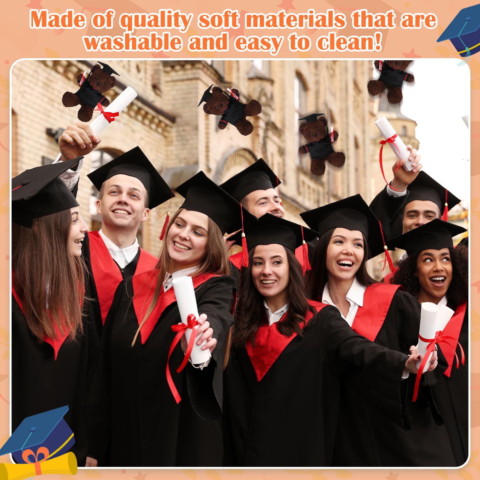 Features: The graduation plush bear costume will be a nice photo prop, and you can make of it to take a lot of meaningful and interesting pictures of them. Of course, you can dress your doll in this doll graduation cap and gown set and take it to your graduation ceremony so that it can witness your formative moments. Specifications: Material: soft materials Color: black, red Size: fits most 8-12 inch small stuffed animals Package includes: 1 x Black graduation hat with black tassel 1 x Black graduation gown 1 x Graduation diploma Notes: Manual measurement, please allow slight errors on size. The color may exist a slight difference due to different screen displays.