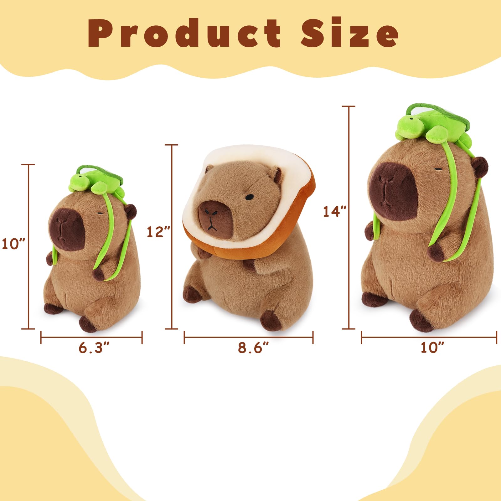 - Q: What is the size of the Achwishap Capybara Plush? A: The Achwishap Capybara Plush is available in multiple sizes, including 10 inches, 12 inches, and 14 inches, making it a versatile choice for different preferences.