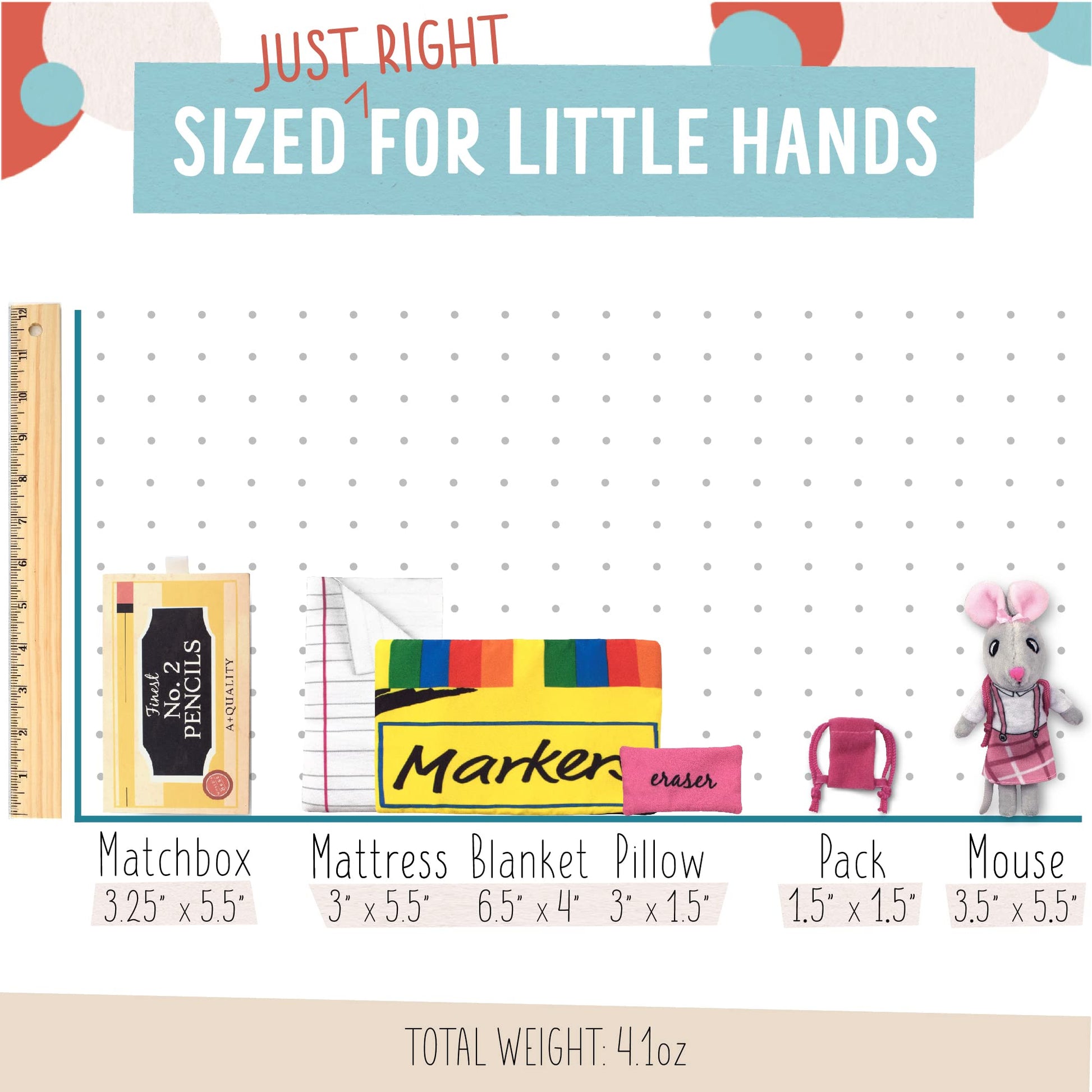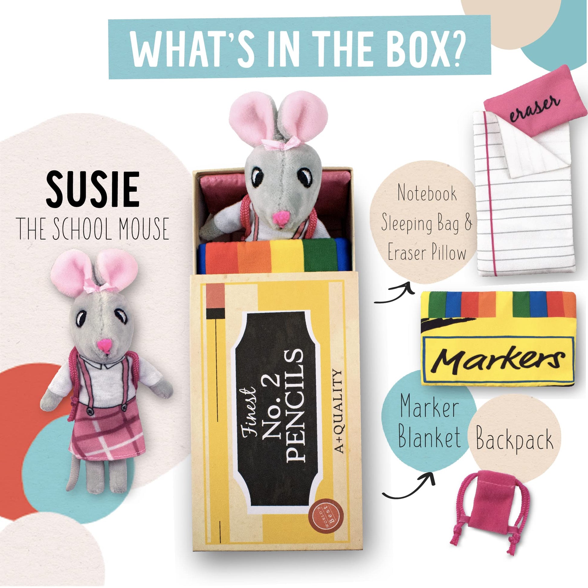 - Q: What is included in the 'Susie The Schoolhouse Mouse' playset? A: The 'Susie The Schoolhouse Mouse' playset includes a small stuffed animal dressed in a soft fabric outfit, themed accessories such as a removable backpack and an eraser pillow, a notebook paper sleeping bag, and a colorful marker blanket, all neatly packaged in a sturdy storage box.