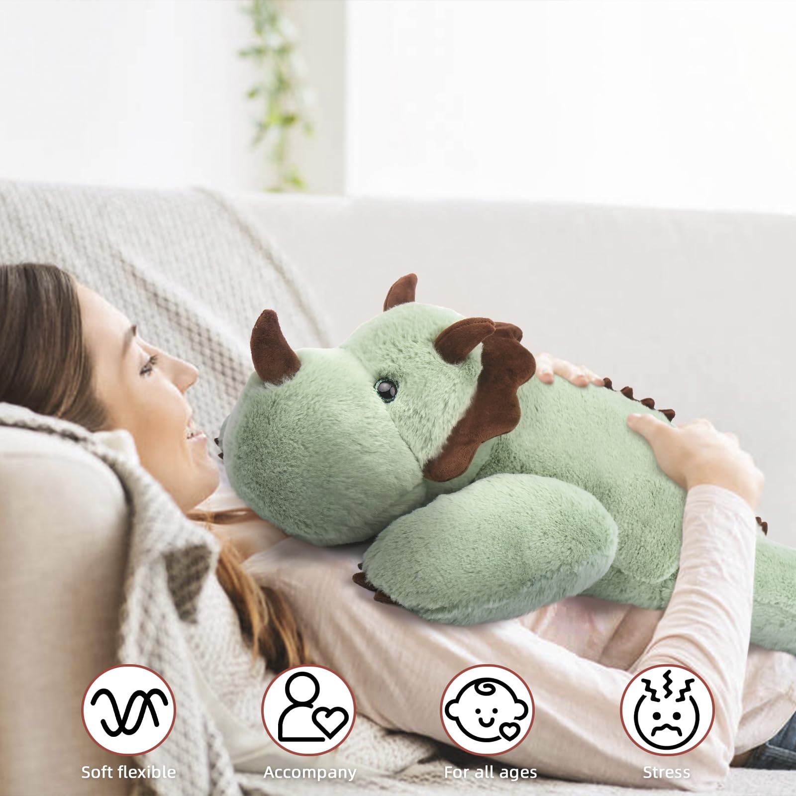 - Realistic Hugging Back Feeling: This plushie features unevenly distributed weights, providing a more engaging experience. With added weight in the abdomen and limbs, it creates a comforting sensation as if the dinosaur is hugging you back, enhancing the cuddling experience.