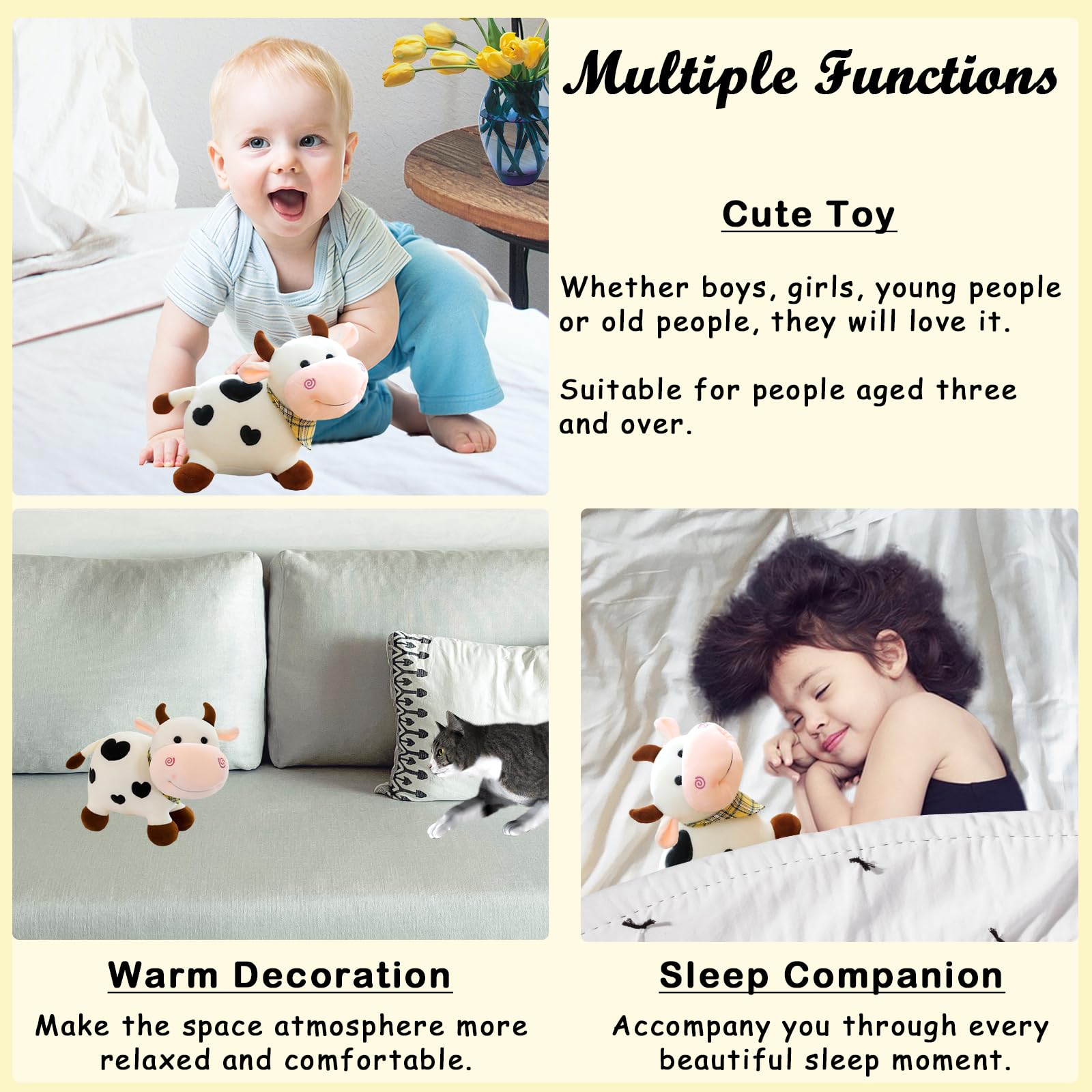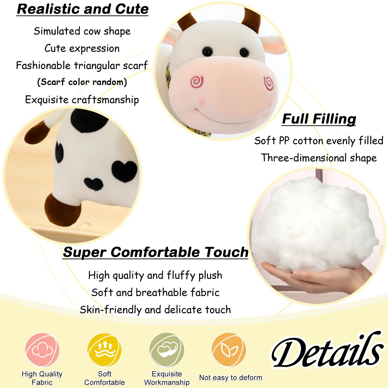 Features: The cow plush toy is fully filled with PP cotton, which is delicate, lovely, comfortable and durable. The stuffed cow plush toy is not only a leisure toy, but also an exquisite decoration. Other functions are waiting for you to discover. The cow stuffed animal is an ideal gift for your family, friends, children and others who are important to you. Specification: Product name: Cow Stuffed Animal Type: Stuffed Toy Product material: PP cotton Product color: White Product size: About 9.84 inch (25 cm) (Full length) Scope of application: People aged three and over Package Includes: 1 Cow Stuffed Animal Notes: Due to the light and screen setting difference, the item's color may be slightly different from the pictures. Please allow slight dimension difference due to different manual measurement.