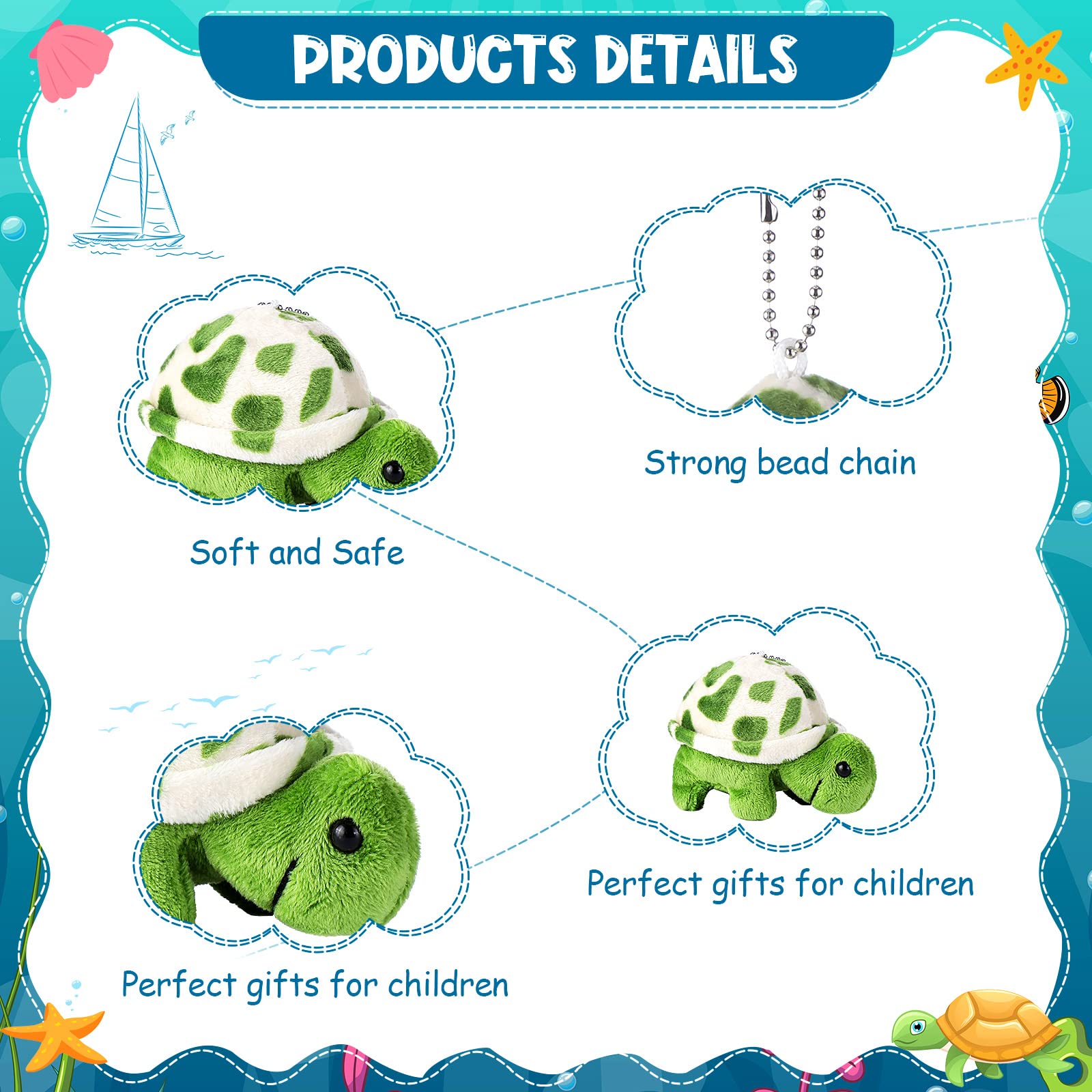Features: These sea turtle plush toy party favors are lovely and appealing, so they are interesting gifts for your family, partners or classmates, especially those who enjoy dolls, readily enhancing the relationship. With quality material and nice workmanship, these sea turtle mini backpack keychains are comfortable, smooth and soft to the play in hand, bringing you a pleasant mood. Specifications: Material: soft material Color: brown, dark green, light green Size: approx. 4.7 inches Package includes: 12 x Sea turtle tiny stuffed animals Notes: Manual measurement, please allow slight errors on size. The color may exist a slight difference due to different screen displays. Choking risk may exist, please keep away from people under 3 years old.
