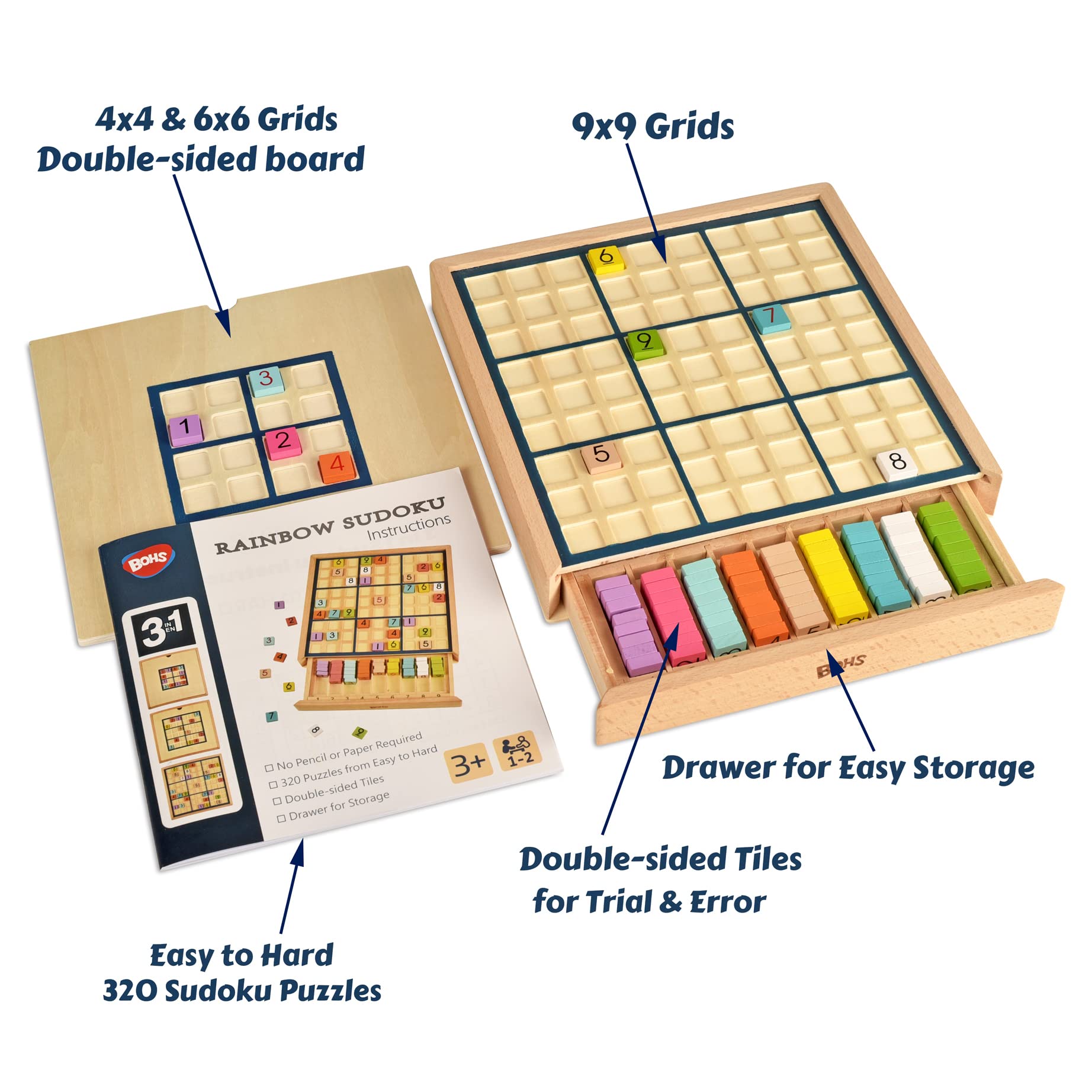 Bohs Wooden Rainbow Sudoku Puzzle - 3 In 1 Easy To Hard - With Sudoku Book Of 320 Puzzles - Desktop Brain Teaser Game Toys
