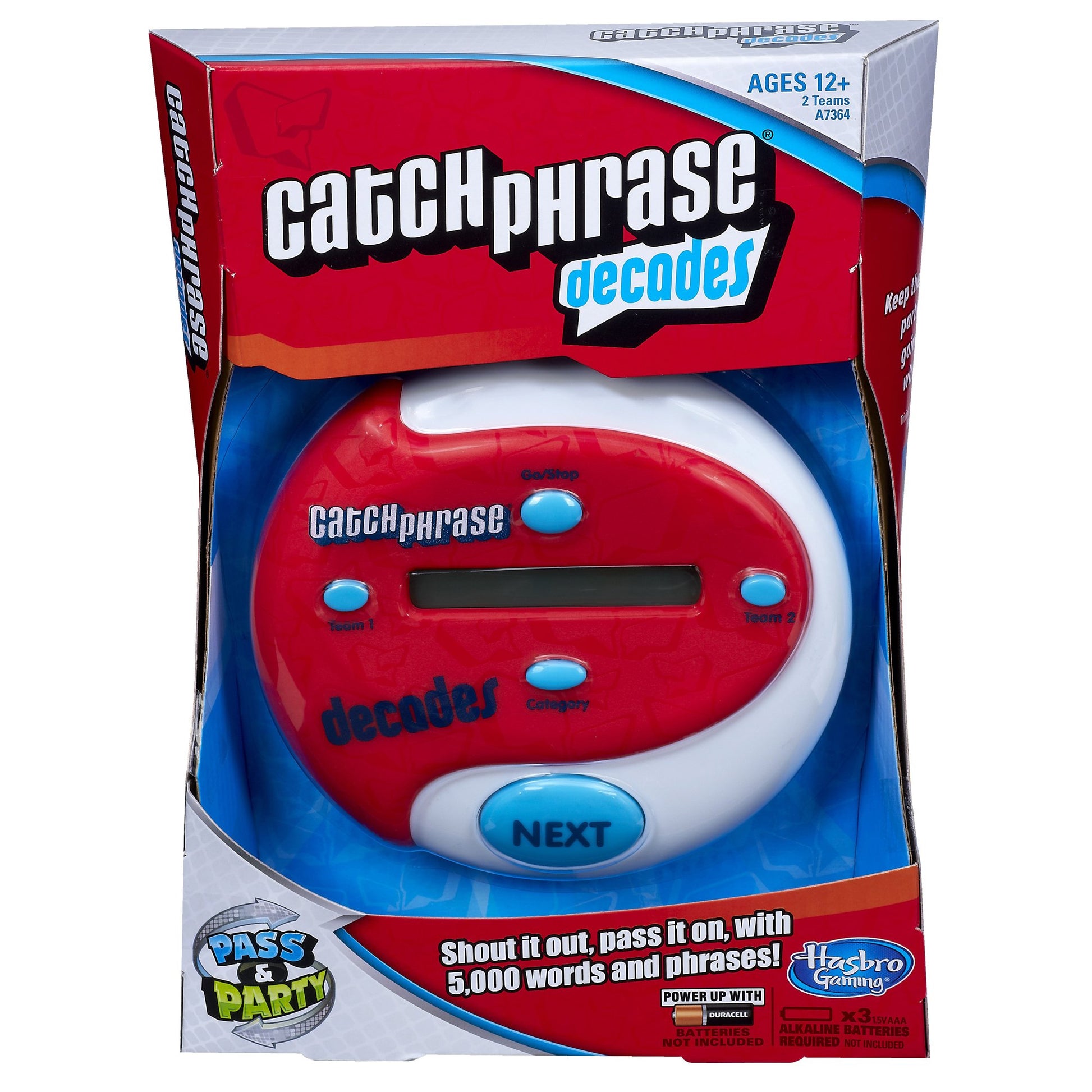 - Q: What is the Catch Phrase Decades game? A: The Catch Phrase Decades game is a handheld electronic party game from Hasbro that features 5,000 words and phrases from various decades, including the 70s, 80s, 90s, 00s, and 10s. Players take turns describing words or phrases to their teammates to guess, making it a fun and interactive addition to family gatherings and parties.