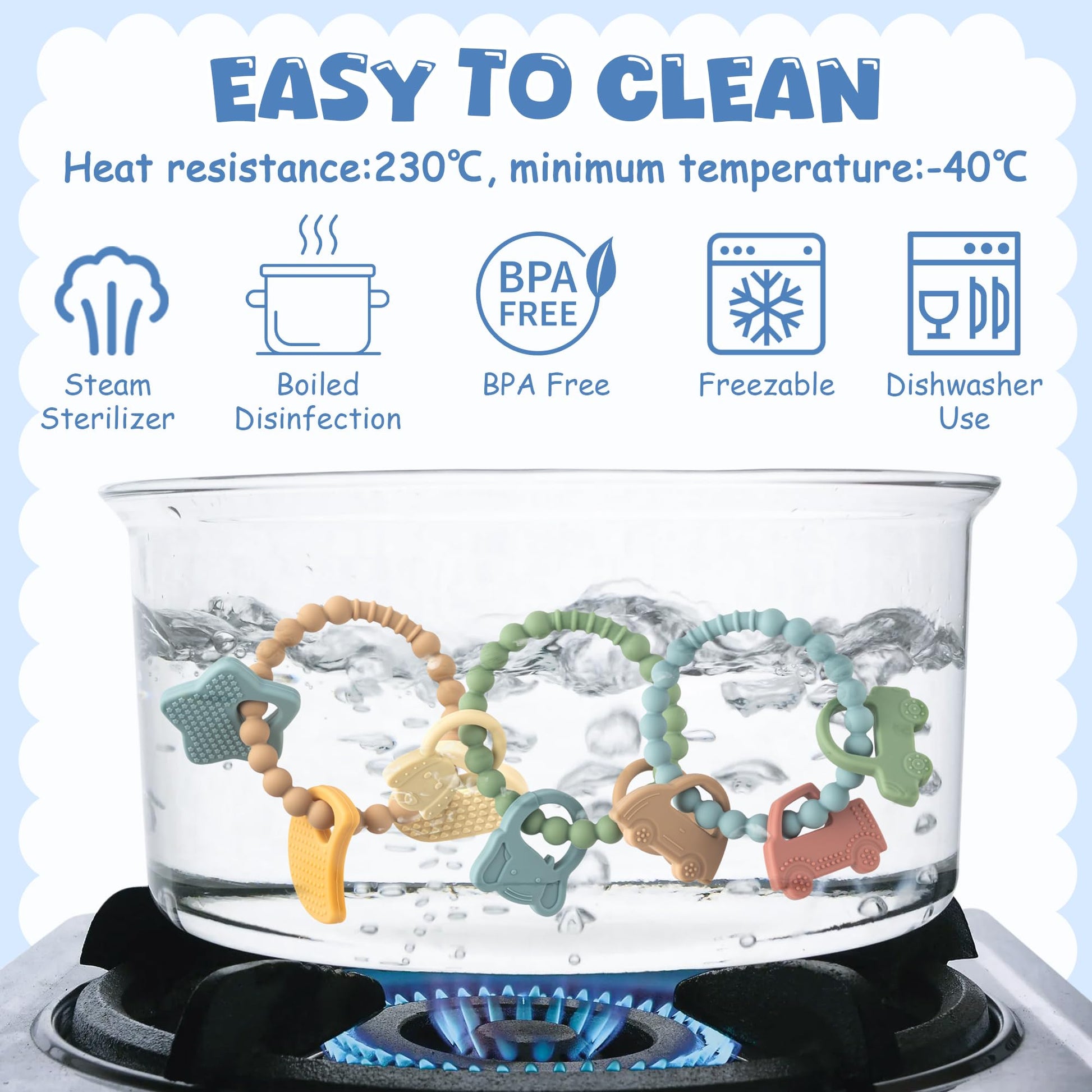 2ooya Silicone Babies Teether Toys - 3Pcs Teething Ring with Rattles, Animal Car Themed Infant Toddle Sensory Chew Toys for Newb