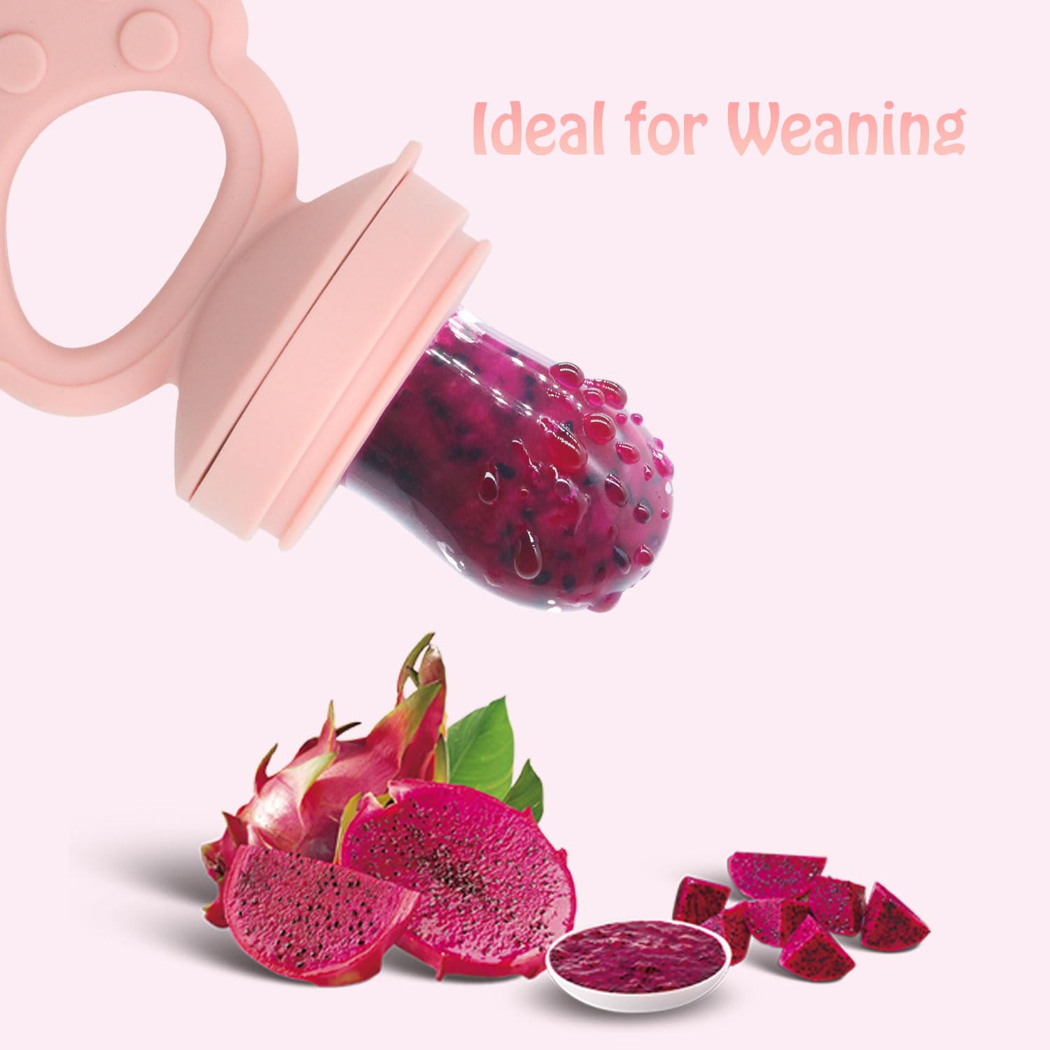 Ginbear silicone baby fruit food feeder & freezer tray set includes 2 baby feeders with smaller pouch, 2 popsicle molds, 2 extra smaller silicone pouches, 4 extra bigger silicone pouches. Its made from top notch BPA-free food grade silicone. And its suitable for babies 4 months and up. Ginbear mesh baby food feeder is not only safe and easy to use, but also a valuable tool for encouraging healthy eating habits and self-feeding skills in babies. The Ginbear baby fruit food feeder pacifier is great for parent looking to make feeding time safer, cleaner, and more enjoyable.