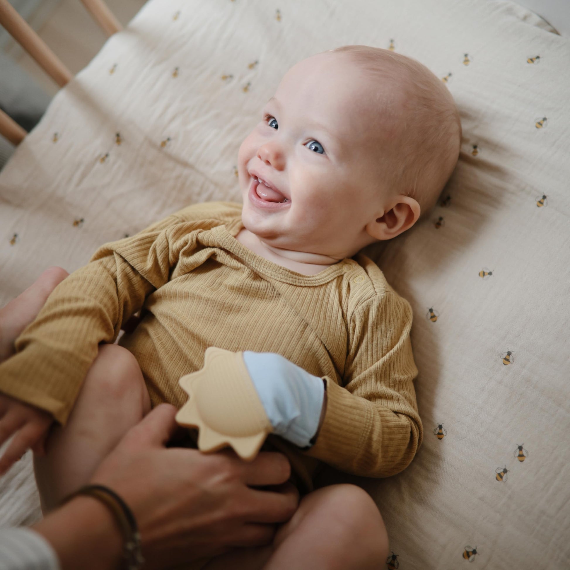 mushie Silicone Teething Mitten for Babies 3 Months+ (Sun) | Textured Silicone & Sensory Fabric with Adjustable Strap