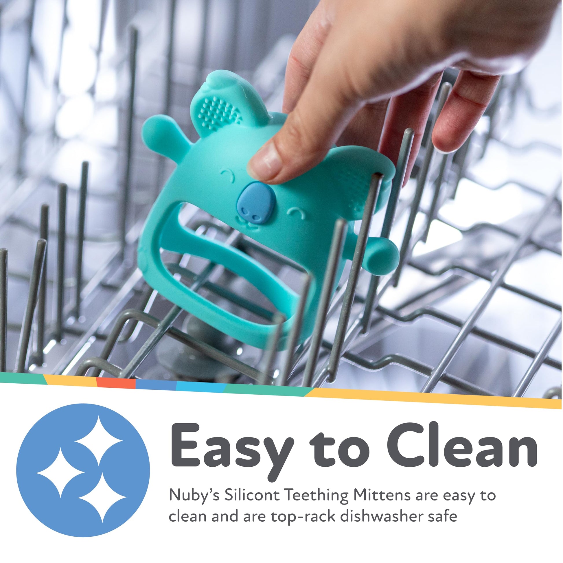 Give your little one a hand as their new baby teeth come in with Nubys Mini Silicone Teething Mitten! This convenient baby teething toy is the perfect solution for babies who arent yet able to hold onto teethers. The Silicone Teething Mitten is comfortable for your little one, and its flexible, too! The soft silicone mitten fits over little hands, and the inner bar provides extra grip support for babies to grasp. Plus, the mitten protects babies from chewing on their hand-or anything else they could get their new teeth on. The characters arms mimic a nipple, helping further soothe fussy little ones. Our teething mitten is dishwasher safe so you can enjoy the perks of easy cleaning! We believe your childs safety is always a priority. The Silicone Teething Mitten is made with materials that exceed all government safety regulations and standards.