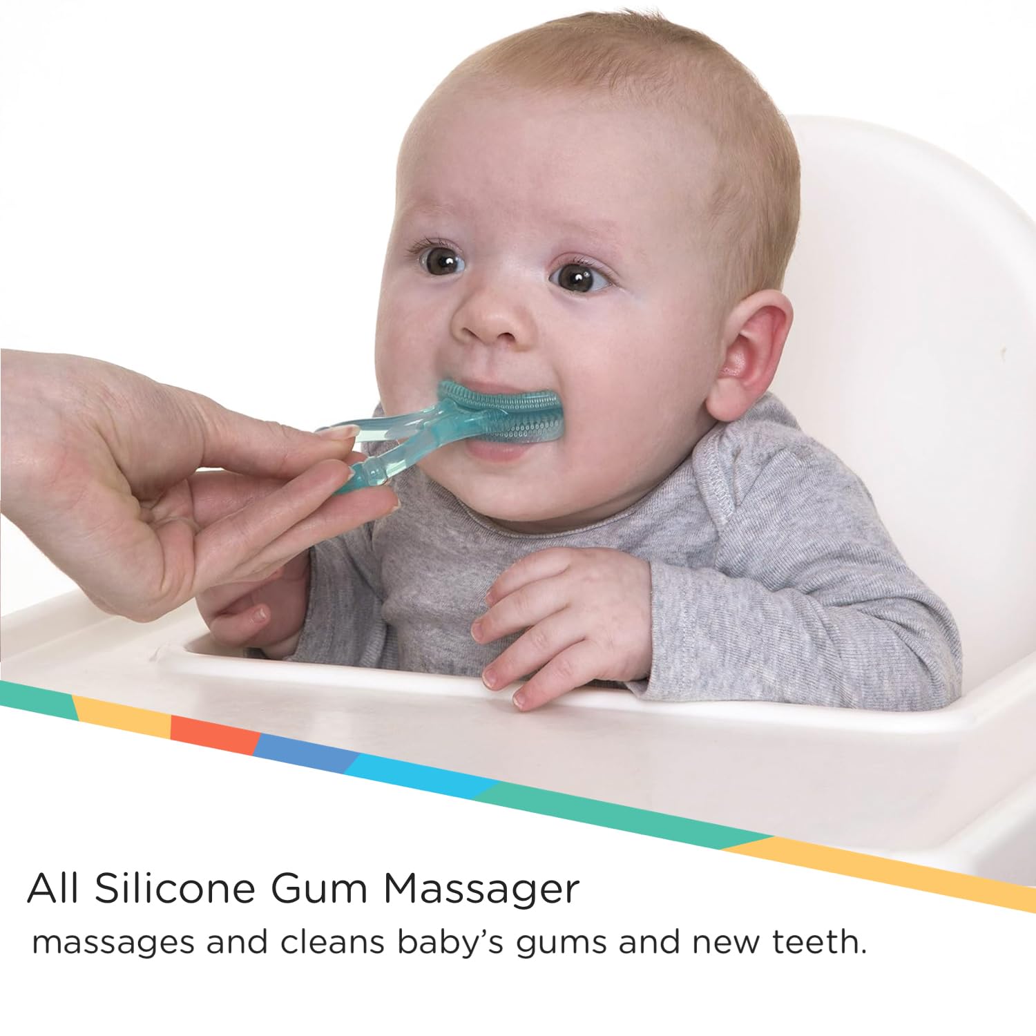 Nuby's Silicone Toothbrush Massager is recommended for babies three months and older. The all silicone massaging bristles massage and clean babys gums and new teeth. The multiple textures soothe, massage, stimulate and clean. The all soft silicone gum massager is sized for little hands to easily hold. Hygienic carrying case keeps silicone massaging brush clean when not in use and is ideal for travel!
