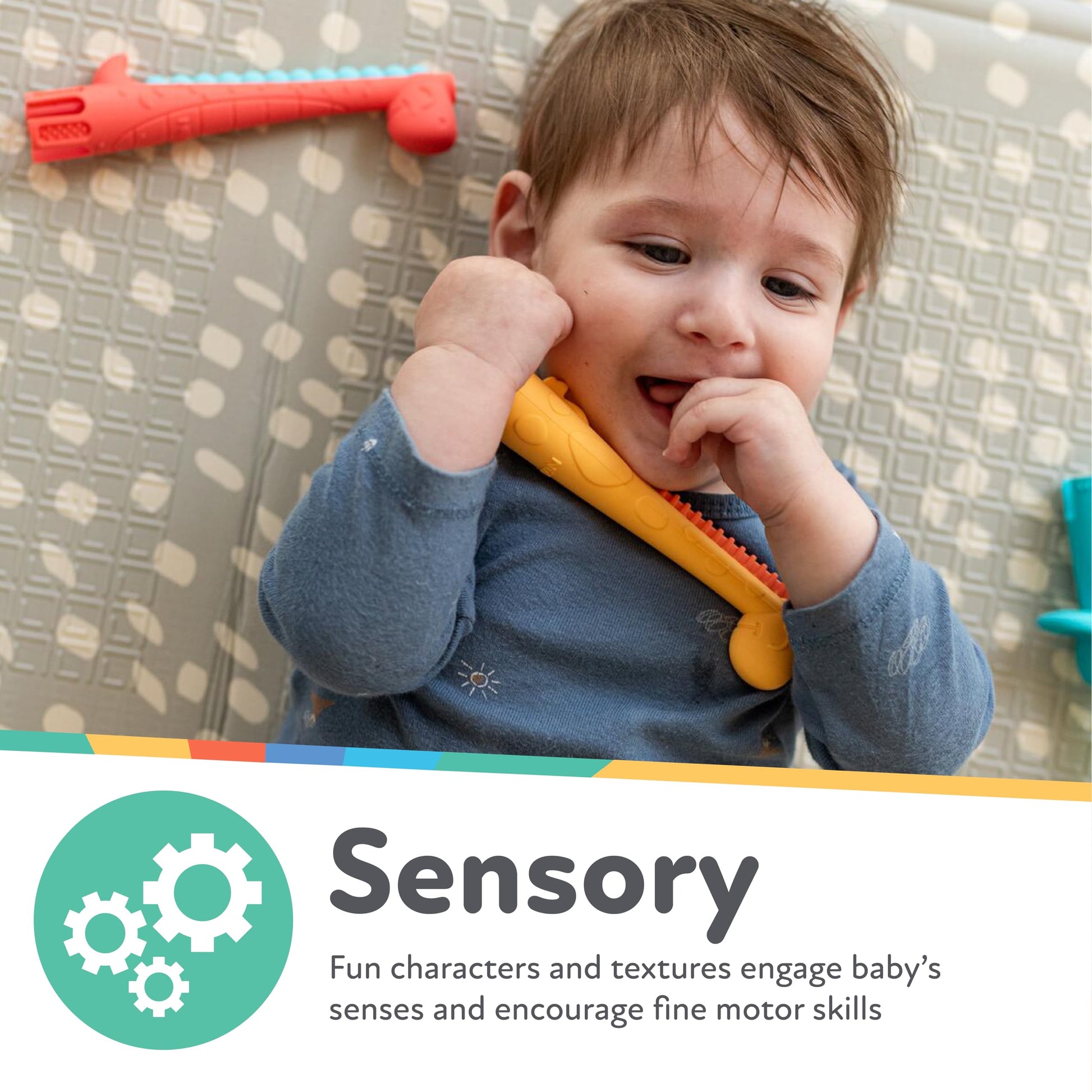 Ease your babys teething discomfort with Nubys Tube Teethers. These Nuby teething toys are made of 100% soft silicone for delicate mouths. Designed to make teething easier, these elephant and giraffe-shaped infant teething toys feature multi-textured surfaces that encourage tactile exploration and gently massage and soothe sore gums. The tube design helps little ones cut molars and is sized to be easy for little hands to grasp and hold. Vibrant colors, a playful shape, and intriguing textures capture your little ones attention, stimulating both sight and touch. Tuck this essential into your babys diaper bag or stroller for on-the-go relief whenever its needed. Nubys baby teething toys are meticulously designed for tiny hands. At Nuby, our mission is to make the teething journey a bit smoother for both you and your little one!