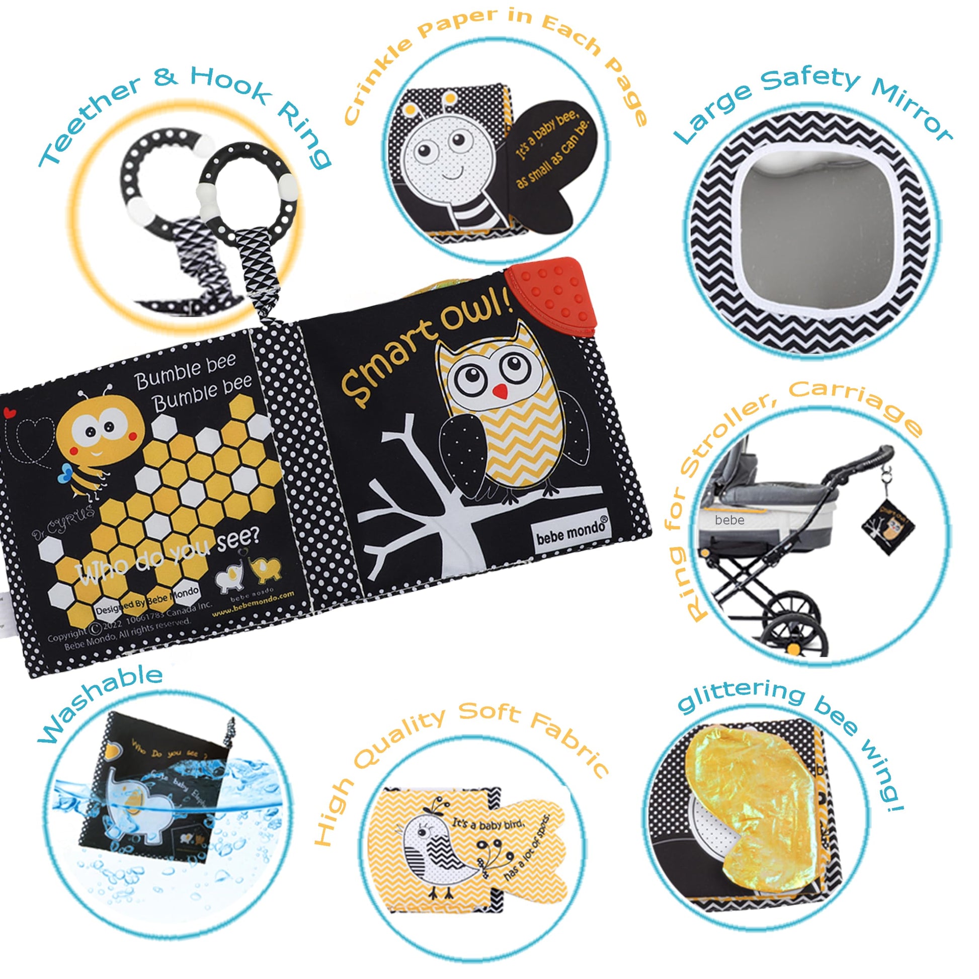 Why Choose Smart Owl & Baby Bumble Bee Crinkle Books? Unique & Appealing Soft Book Design: Designed based on the joyful and classical Who do you see? theme, Baby Owl Toys and Baby BumbleBee lightweight fabric book is extremely soft and each page has a new and exciting adventure of the forest animal world to explore; Peek-a-boo flap, touch and feel newborn toys, crinkle toy, large mirror, gift & teether ring for babies, altogether makes a fantastic gift for 0-3 3-6 months and 1-year-old babies.No need to remind that, babies love lift a flap book! Educational & Early Learning busy book with Entertaining Features On Every Page: This peekaboo forest baby books we are selling on Bebe mondo would be the right choice to make your baby happy and learn the little ones some essential skills.The positive outcomes of reading book for babies could not be overstated.International research shows that children who had books read aloud to them as a baby are more successful at school and incredibly grow imagination.This educational toy book is one big adventure! Premium Quality: Infants like to discover everything by putting it in their mouth and this premium fabric baby toy, safe, washable, cloth book with strong stitching is exactly safe, durable and chewable! Great gift ,2 In 1 Gift For Babies: Bebe Mondo Black and white toys, infant activity books have a teething ring which at the same time could be used to be hanged from baby strollers & baby carriage to be carried easily & in the meantime make your kid amused. Customer Satisfaction Is Our Top Priority: Bebemondo team make their best to deserve your highest level of satisfaction.Any thoughts, new ideas, concerns or even problems; please be kind to share that with us. we are always ready to help!we will do our best to serve you.Bebe mondo is an American Brand,with High quality stroller toys, newborn toys, jungle baby books