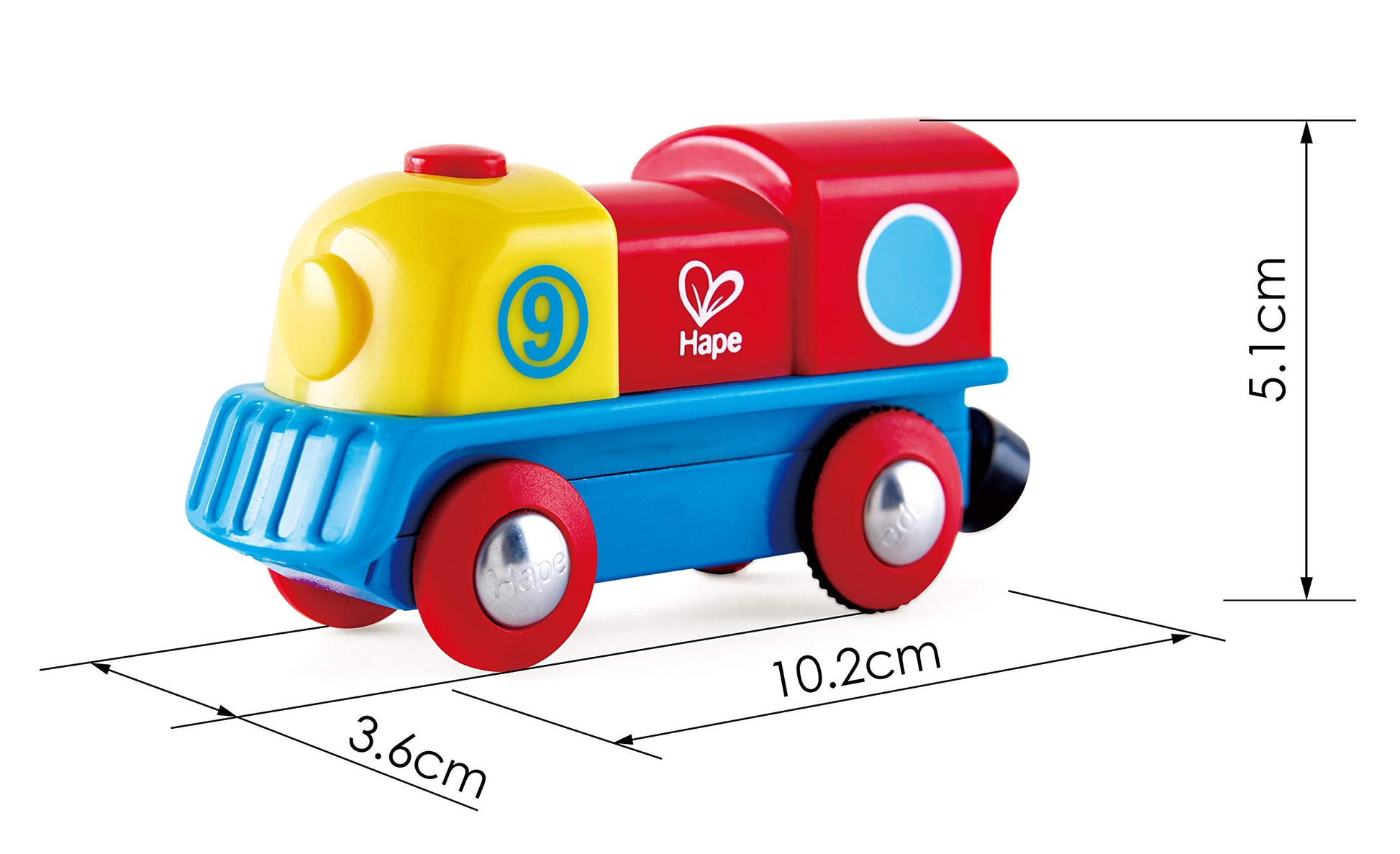 This colorful engine has a powerful motor that helps it to climb hills and ramps. The operating button on top can be easily operated by little fingers and has forward and stop positions. Magnetic coupling at rear allow for easy connecting with compatible carriages. A great addition to your Hape railway set! Designed for ages 18 months and over. Durable child safe paint finish and solid wood construction make this a toy your child will love for years to come. Hape toys stimulate children through every stage of development and help nurture and develop their natural abilities. All Hape products sold in North America meet or exceed all applicable safety standards.