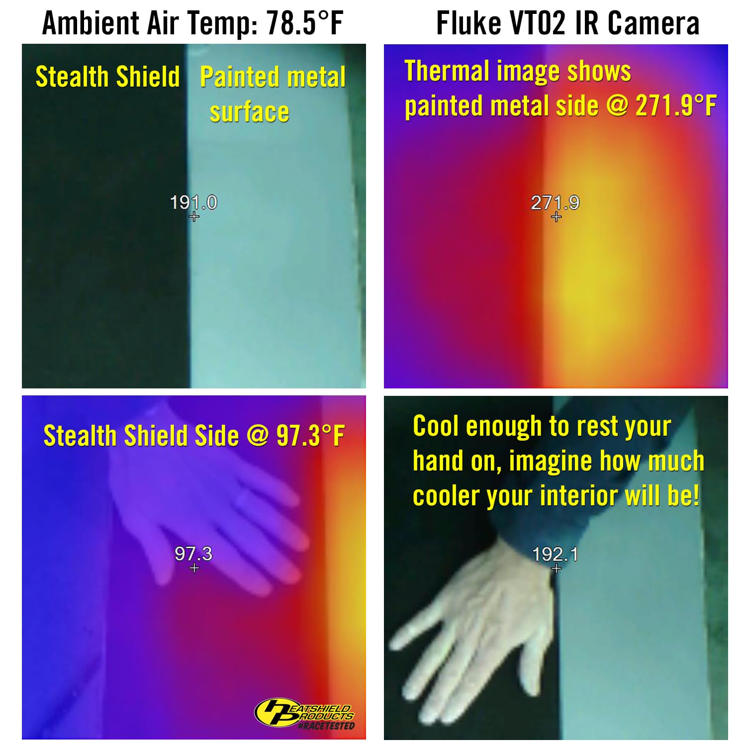 • Q: What temperatures can the HP Stealth Shield withstand? A: The HP Stealth Shield can withstand continuous temperatures of up to 1800 degrees Fahrenheit and intermittent temperatures of up to 2000 degrees Fahrenheit, making it highly effective in protecting your vehicle's interior from extreme heat.