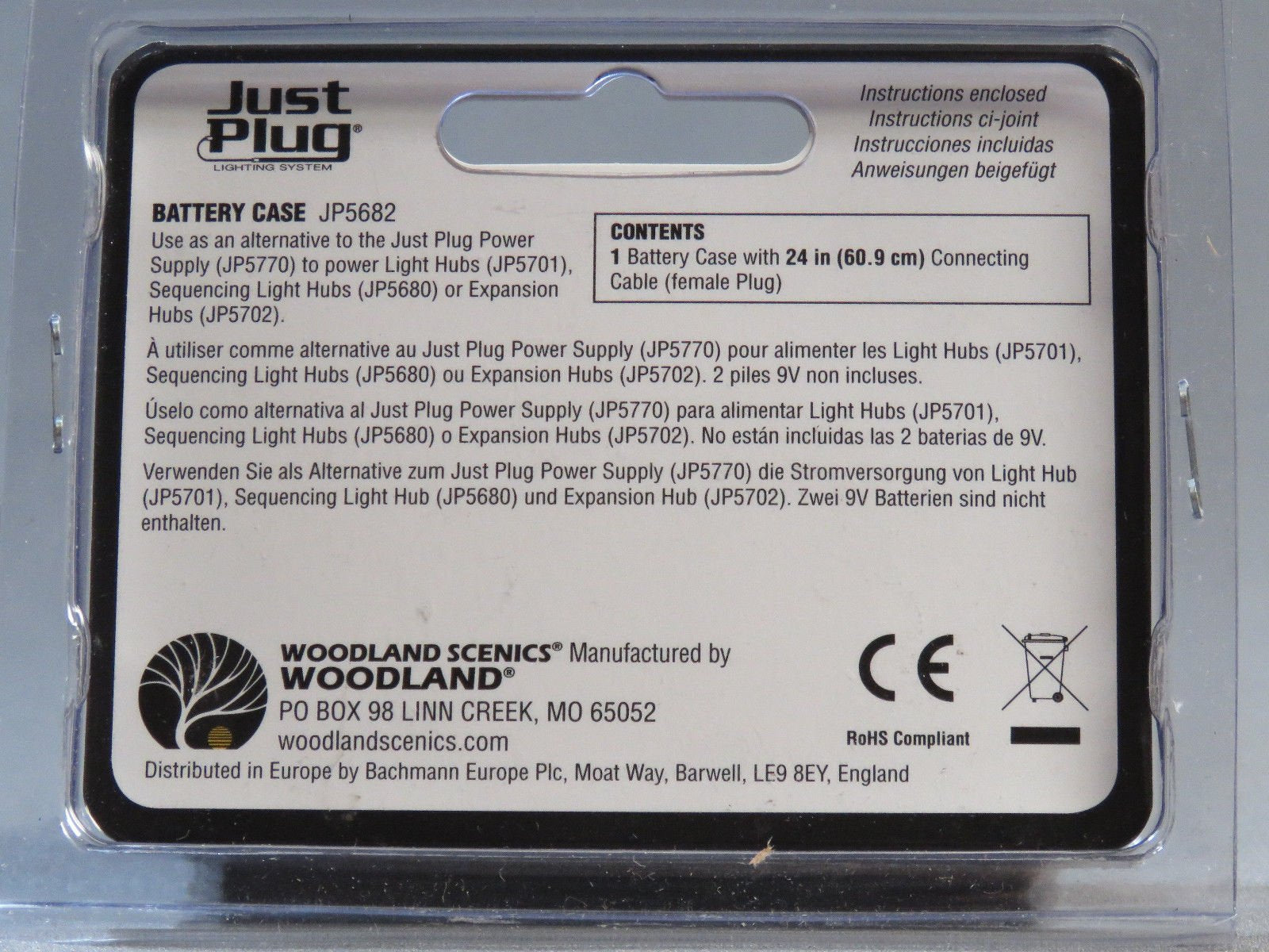 - Q: What is the Woodland Scenics JP5682 Battery Case used for? A: The Woodland Scenics JP5682 Battery Case is designed to power the Just Plug Lighting System, serving as an alternative to the standard Just Plug Power Supply. It can effectively power Light Hubs, Sequencing Light Hubs, and Expansion Hubs.