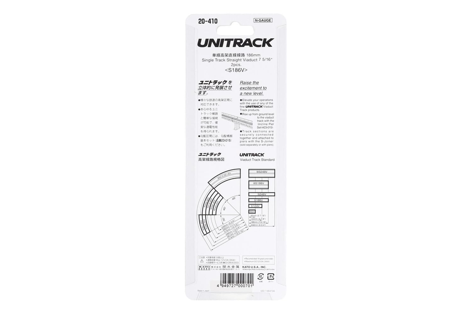 - Q: What are the dimensions of the Kato KAT20410 Viaduct? A: The Kato KAT20410 Viaduct measures 186mm in length, with a width of 3.94 inches, and a height that is compatible with standard N scale train sets.